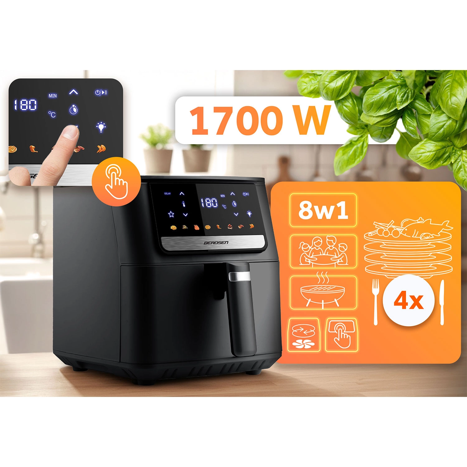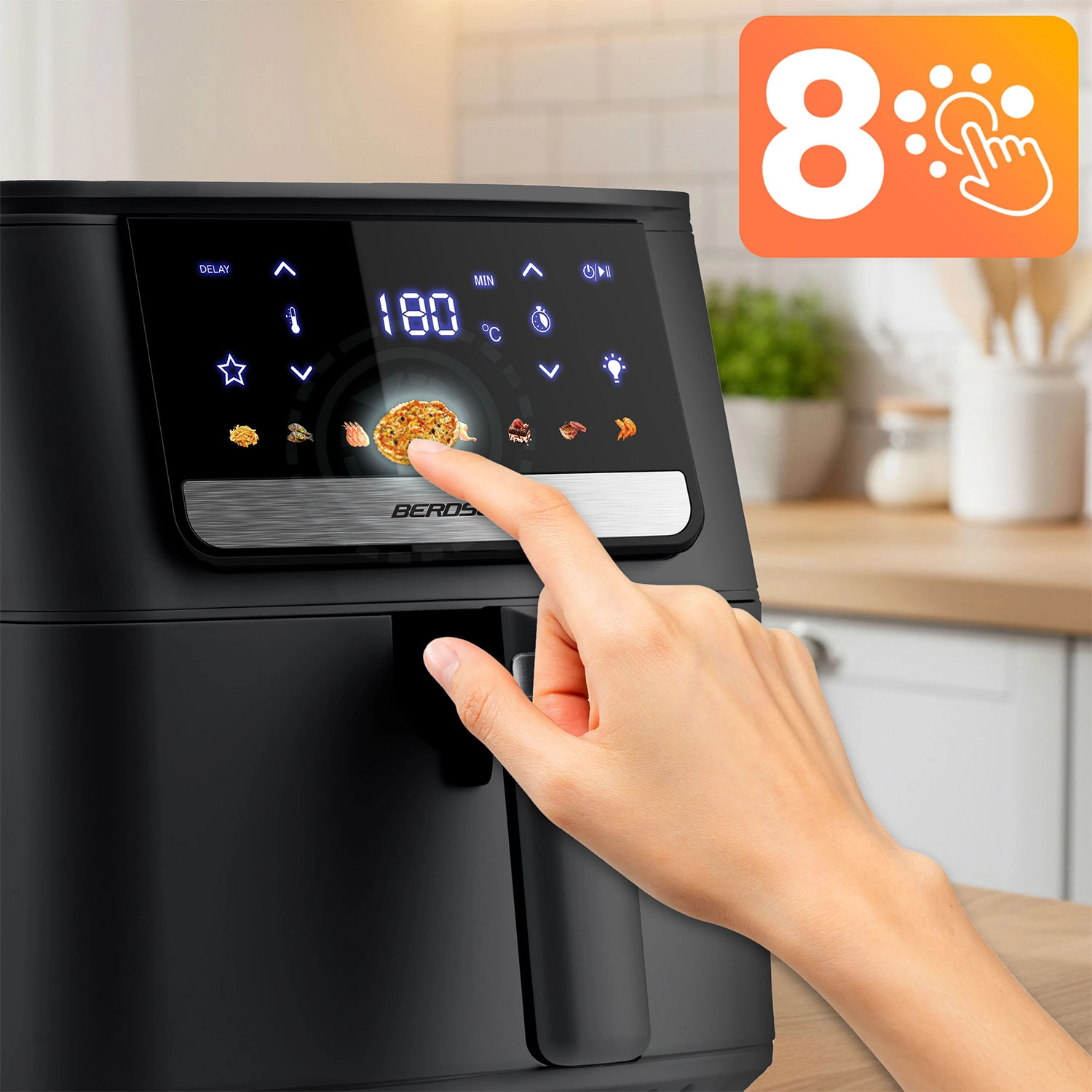 Modelul BERDSEN BD-662 îmbină stilul cu funcționalitatea: panou tactil intuitiv cu pictograme clare, 8 programe pentru cartofi prăjiți, pește, pui, creveți, fripturi, prăjituri, pizza și aripioare, plus setarea temperaturii până la 200 °C. Datorită volumului de 6,5 l pregătești cina pentru familie, un bol mare de cartofi pentru prieteni sau chiar un pui întreg. Coșul și tava pot fi spălate în mașina de spălat vase, iar dispozitivul are oprire automată și protecție la supraîncălzire.