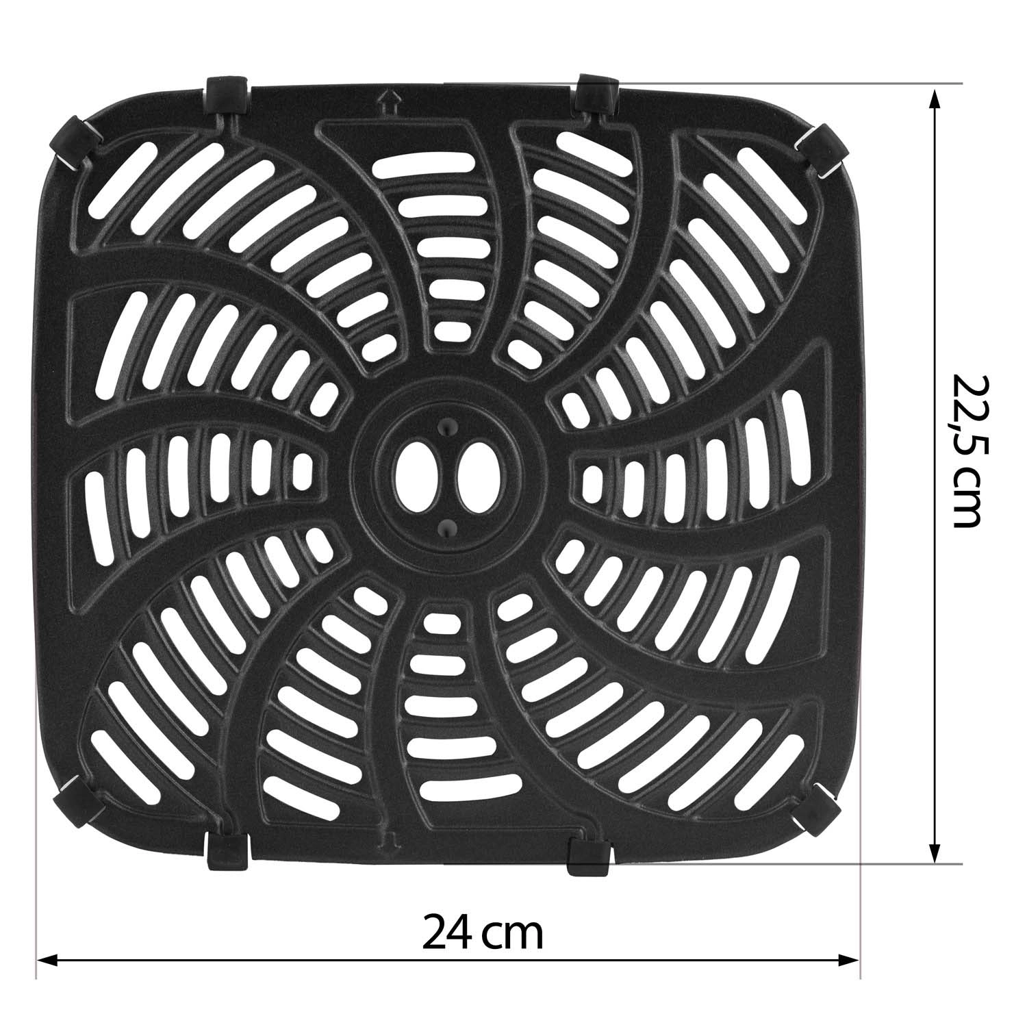 Dimensiunile 24 × 22,5 cm se potrivesc perfect modelelor menționate și susțin circulația uniformă a aerului fierbinte.