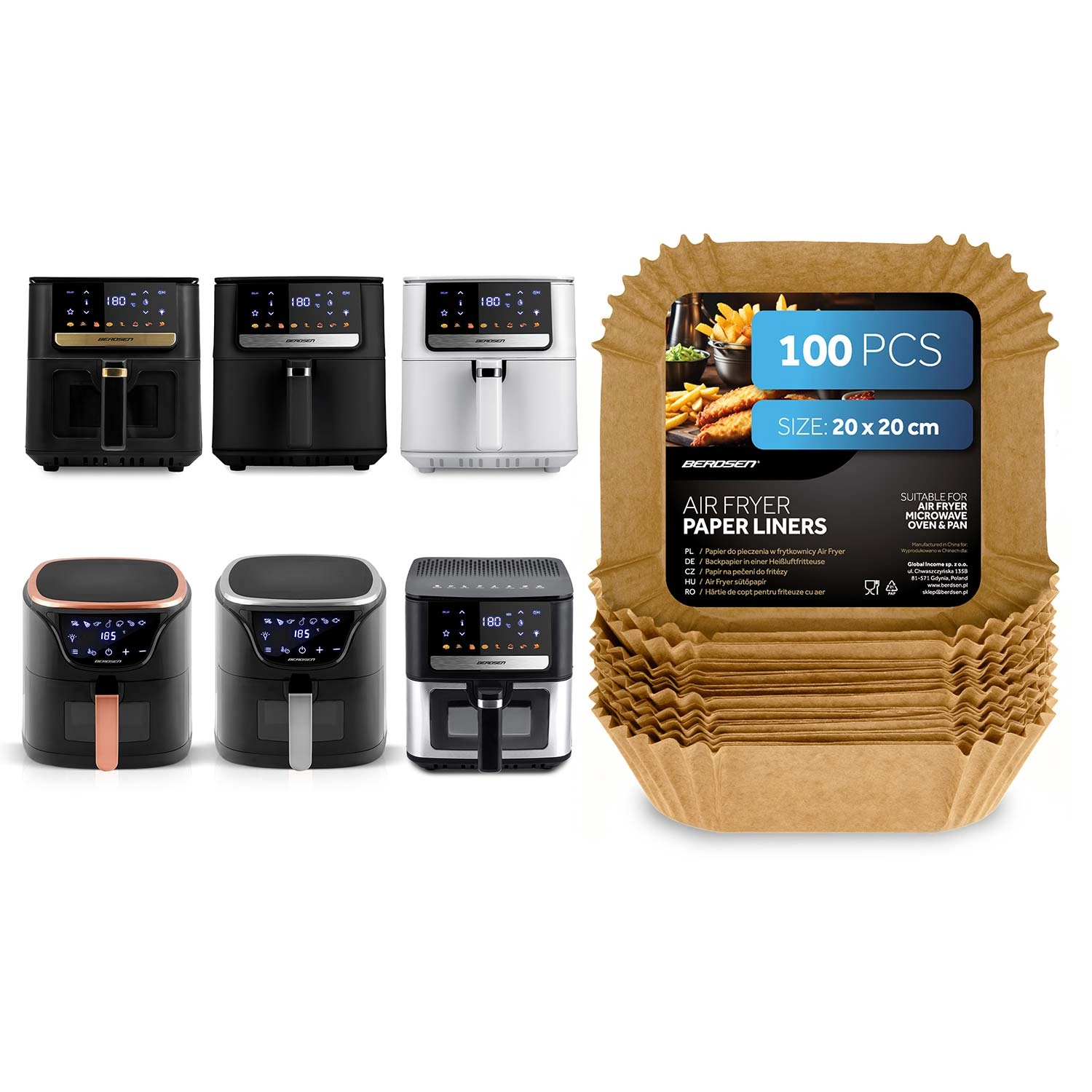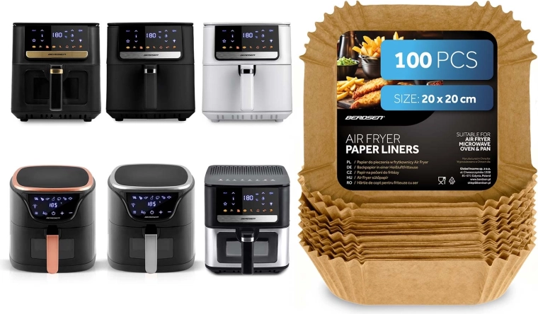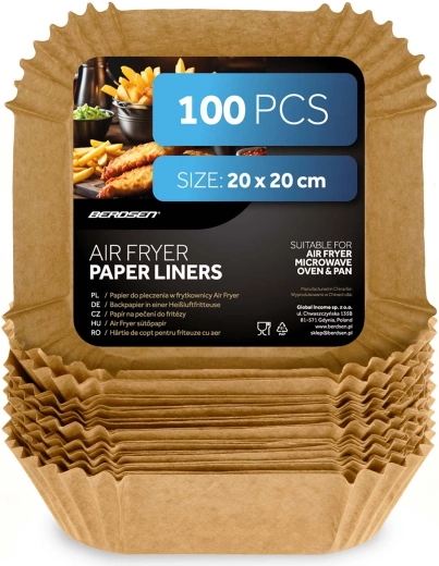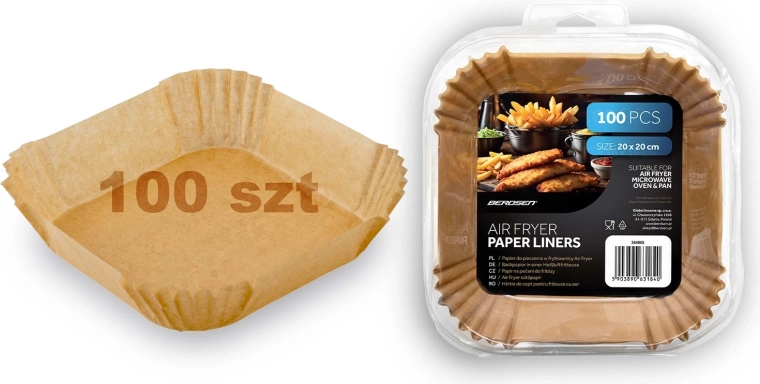Inserțiile pătrate de hârtie 20 × 20 cm sunt ideale pentru friteuzele cu aer cald, dar și pentru cuptorul cu microunde, cuptorul clasic sau tigaie. Construcția de unică folosință și suprafața antiaderentă ușurează scoaterea alimentelor și mențin aparatele igienic curate. Potrivite pentru cartofi prăjiți, aripioare de pui, nuggets și produse de panificație.