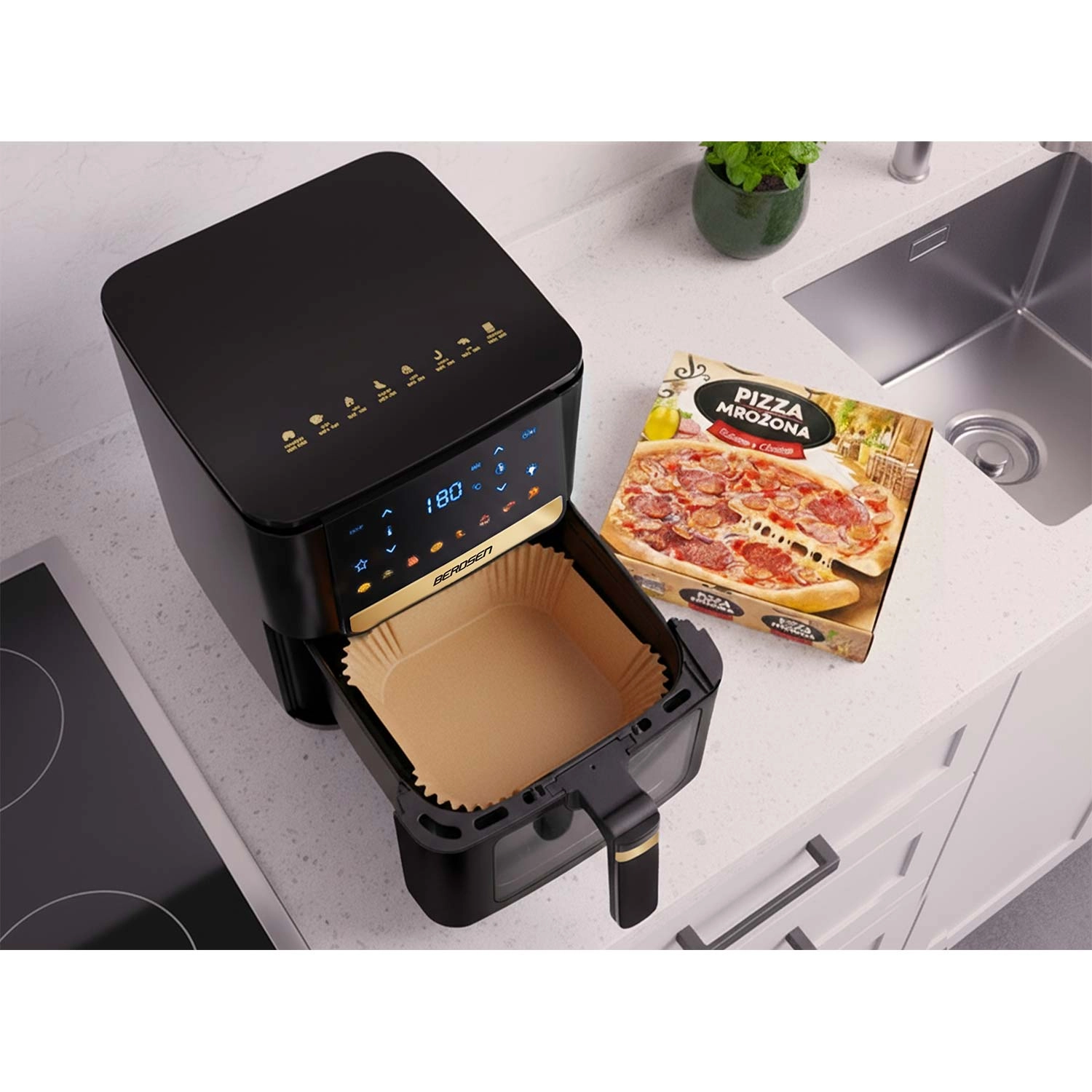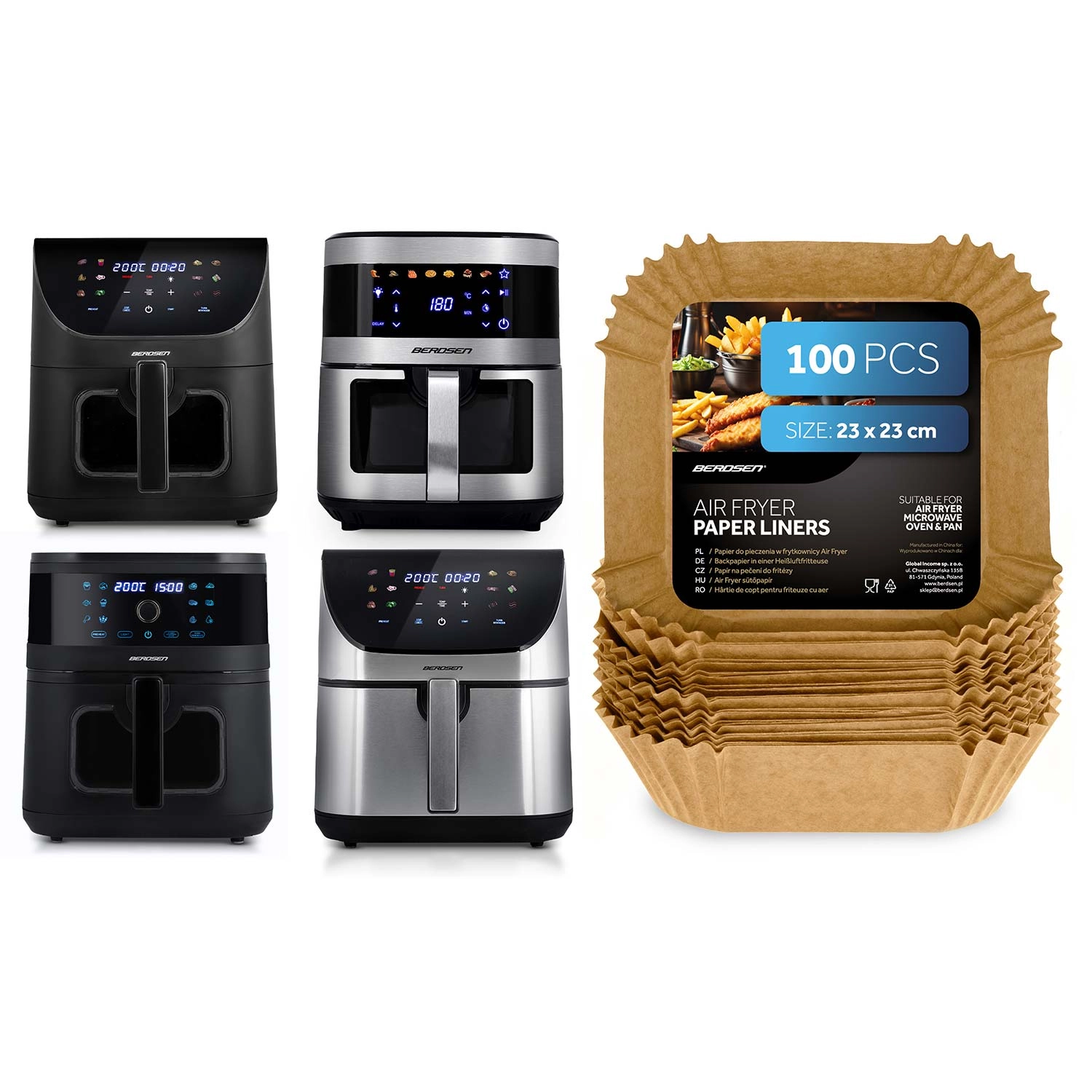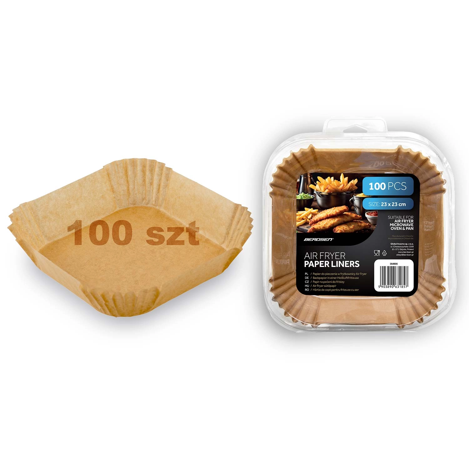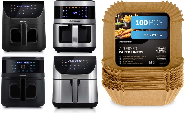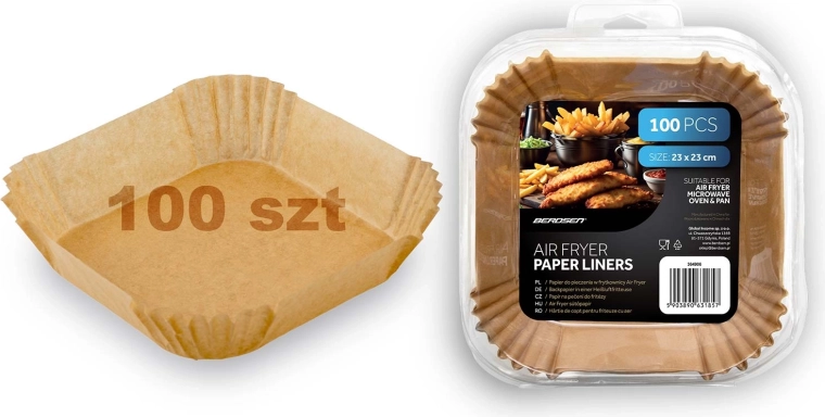 Practicile inserții de hârtie pentru friteuză sunt realizate din hârtie de copt și modelate în formă pătrată, cu margini înalte plisate (cca 4,5 cm). Datorită acestora, mâncarea se lipește mai puțin, se scoate mai ușor, iar după gătit este suficient să aruncați inserția. Dimensiunea de 23 × 23 cm se potrivește cu numeroase coșuri și tăvi și este adecvată atât pentru cuptorul cu microunde, cât și pentru cuptor.