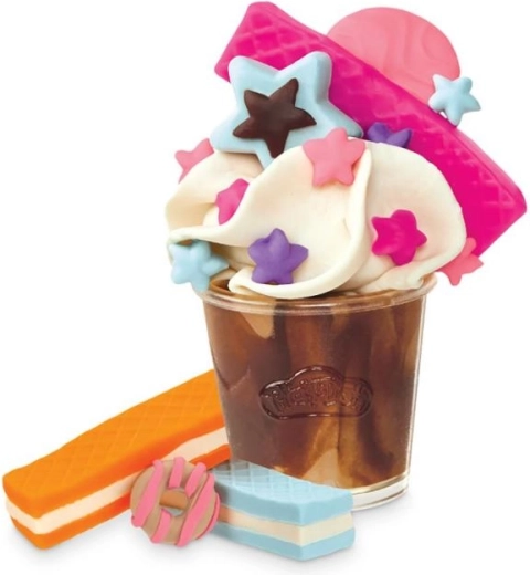Prin simpla apăsare a pârghiei, umpli paharul cu „înghețată moale” sau cu o băutură colorată și îl decorezi cu toppinguri și forme din matrițe. Ideal pentru joaca de-a barista și dezvoltarea imaginației.