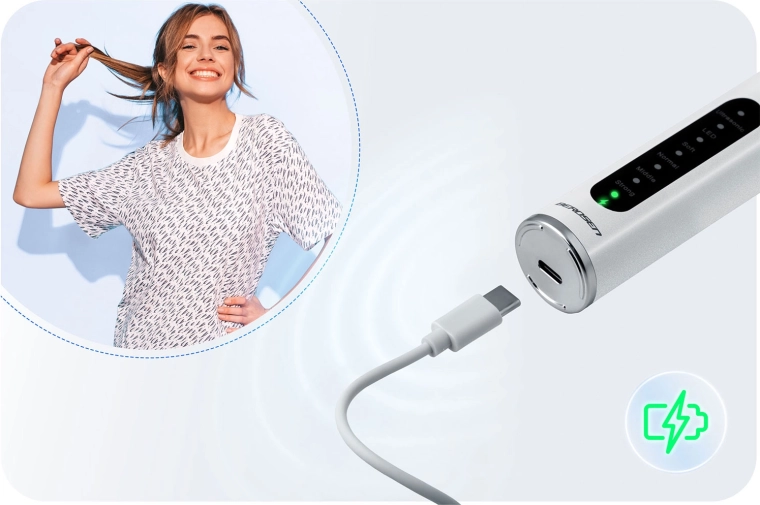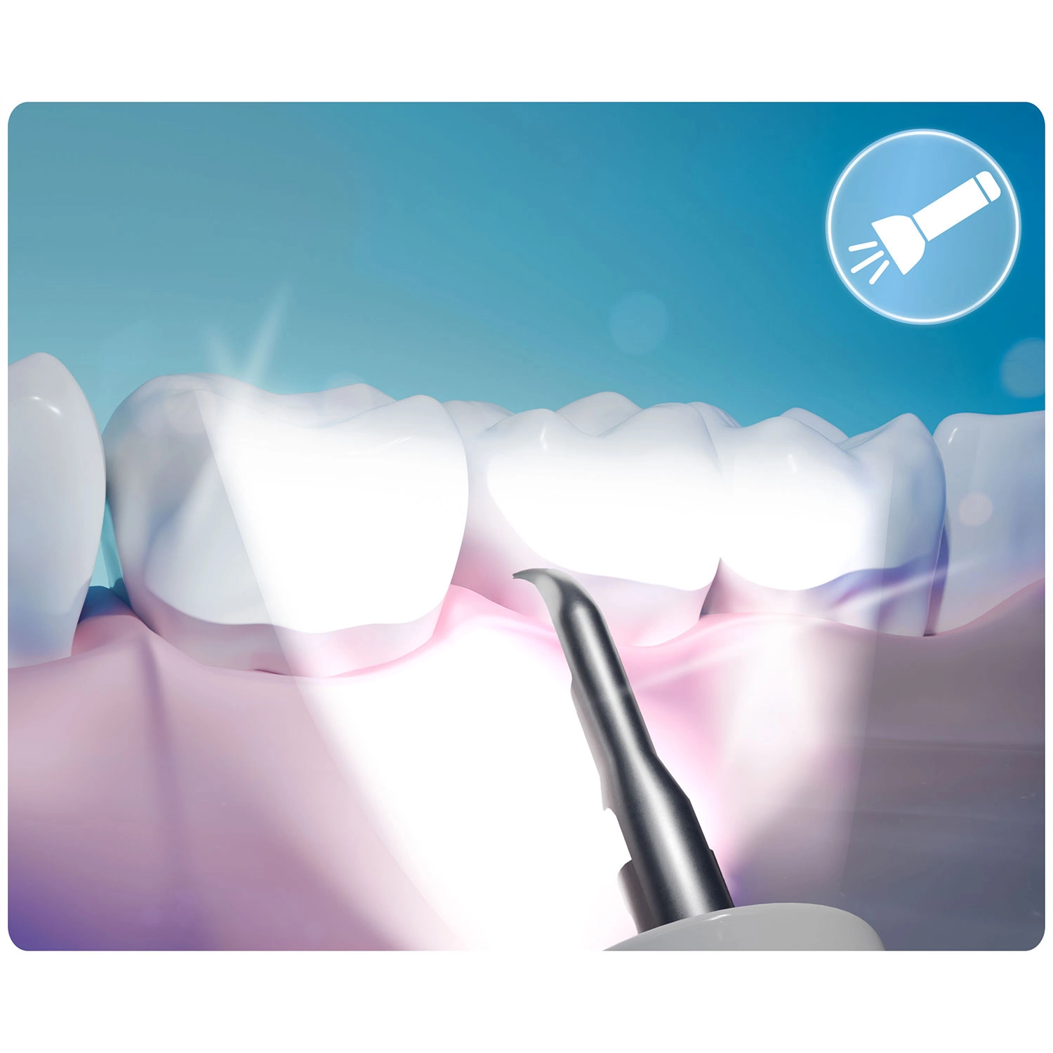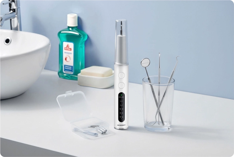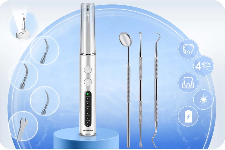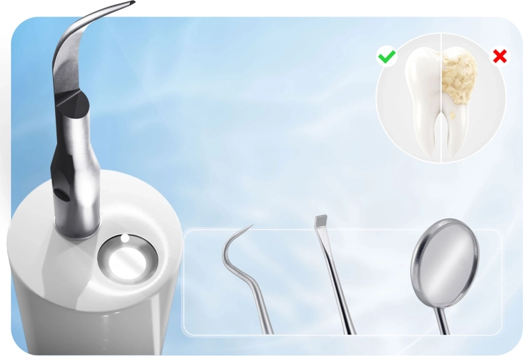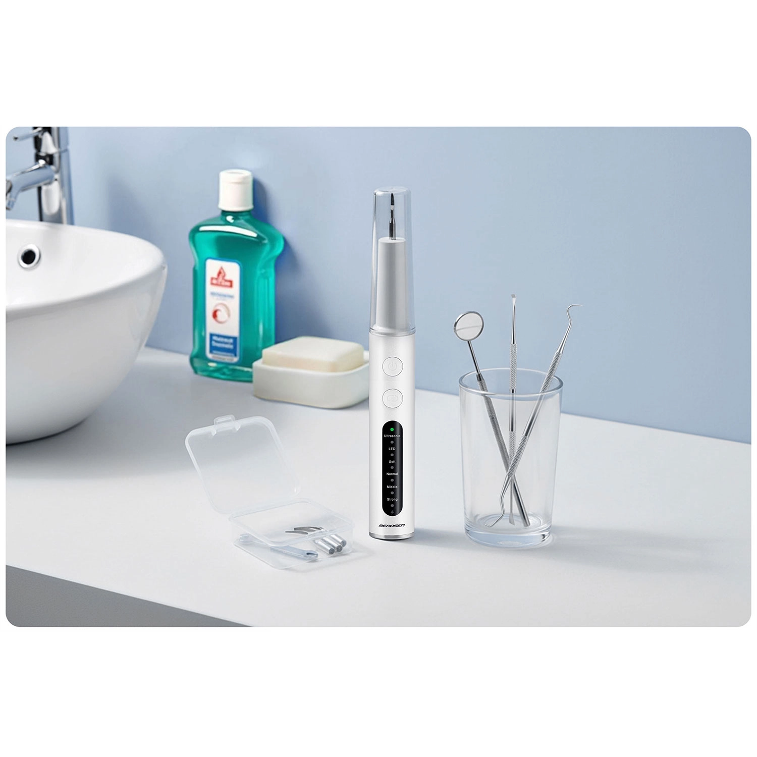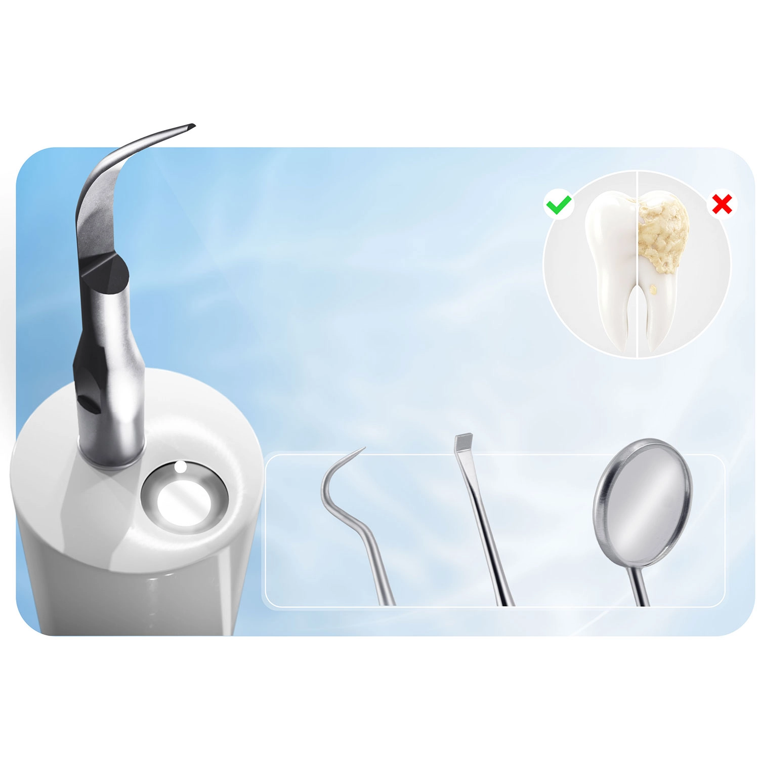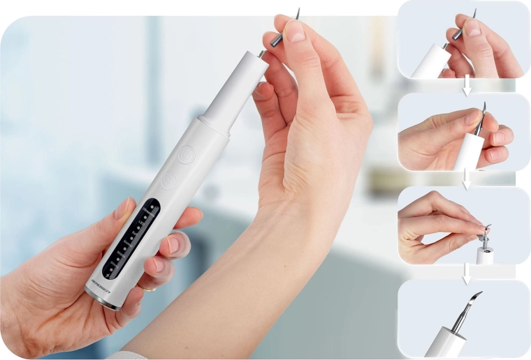 Accesorii bogate și întreținere ușoară: În pachet găsiți 4 capete interschimbabile (2 plate, 2 ascuțite) pentru diferite tipuri de curățare, set de instrumente dentare din inox (oglindă, racletă, sondă) și cheiță pentru schimbarea capetelor. Prinderea pe filet asigură stabilitate în timpul utilizării. Datorită încărcării USB‑C și bateriei puternice, puteți efectua multe sesiuni cu o singură încărcare. Construcția cu rezistență IPX7 face față stropilor de apă.