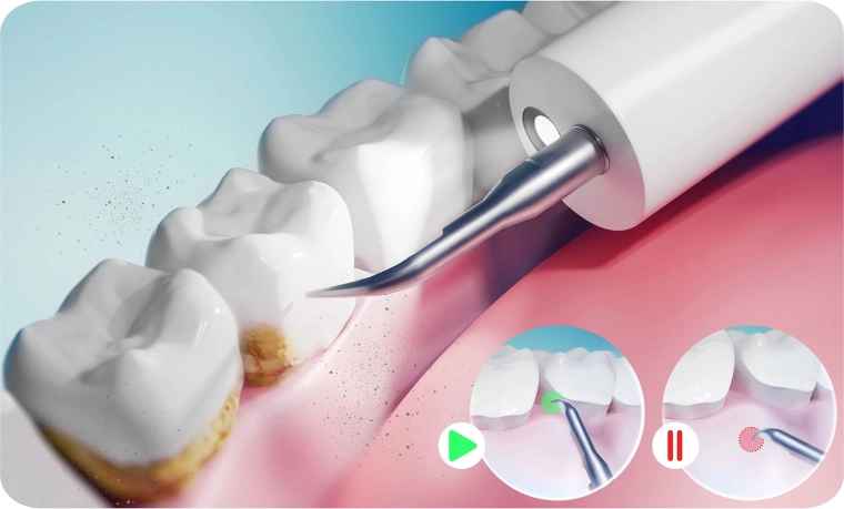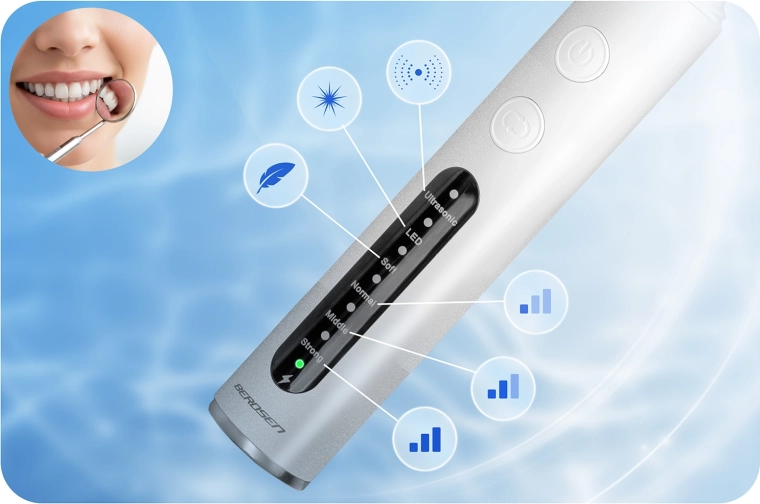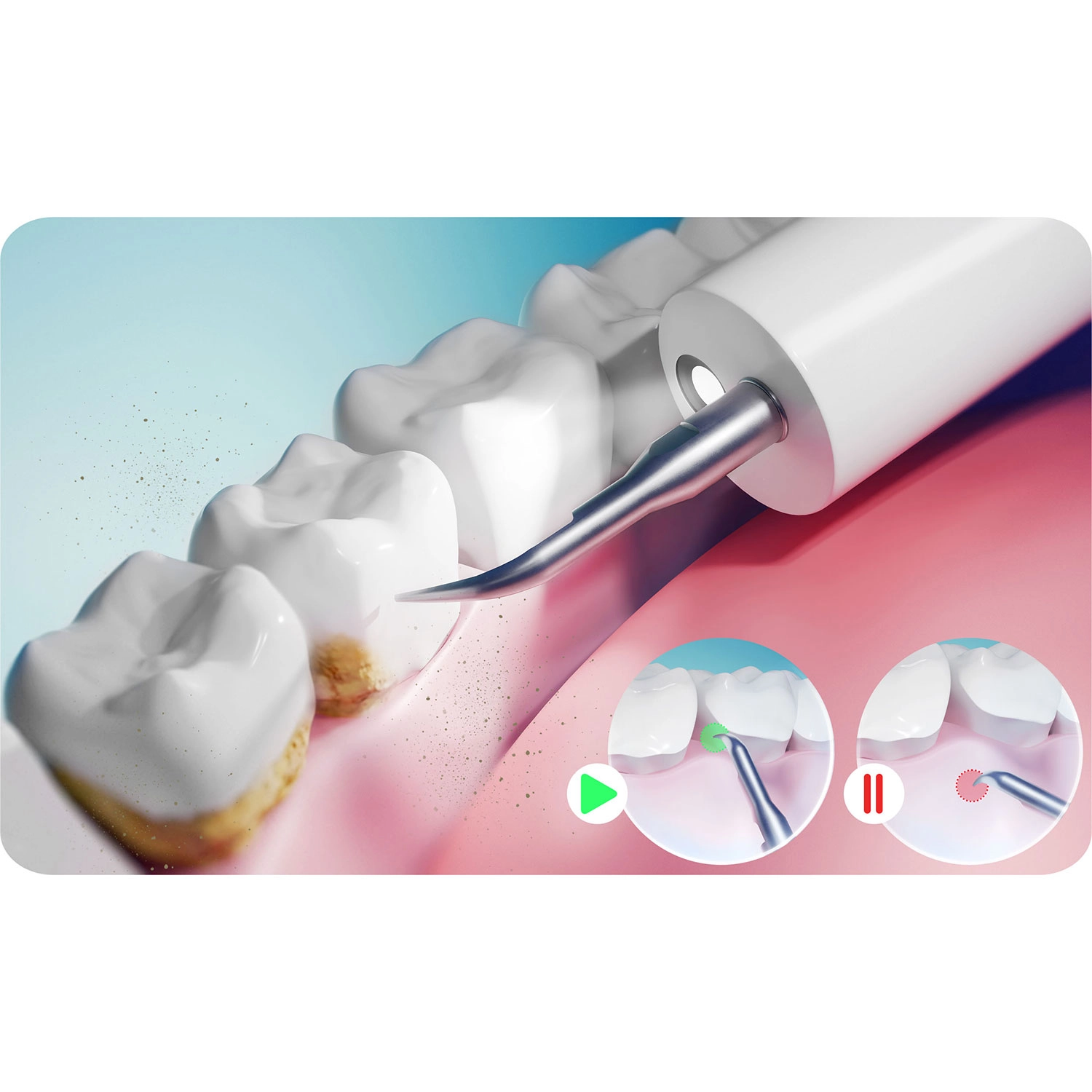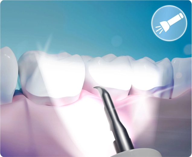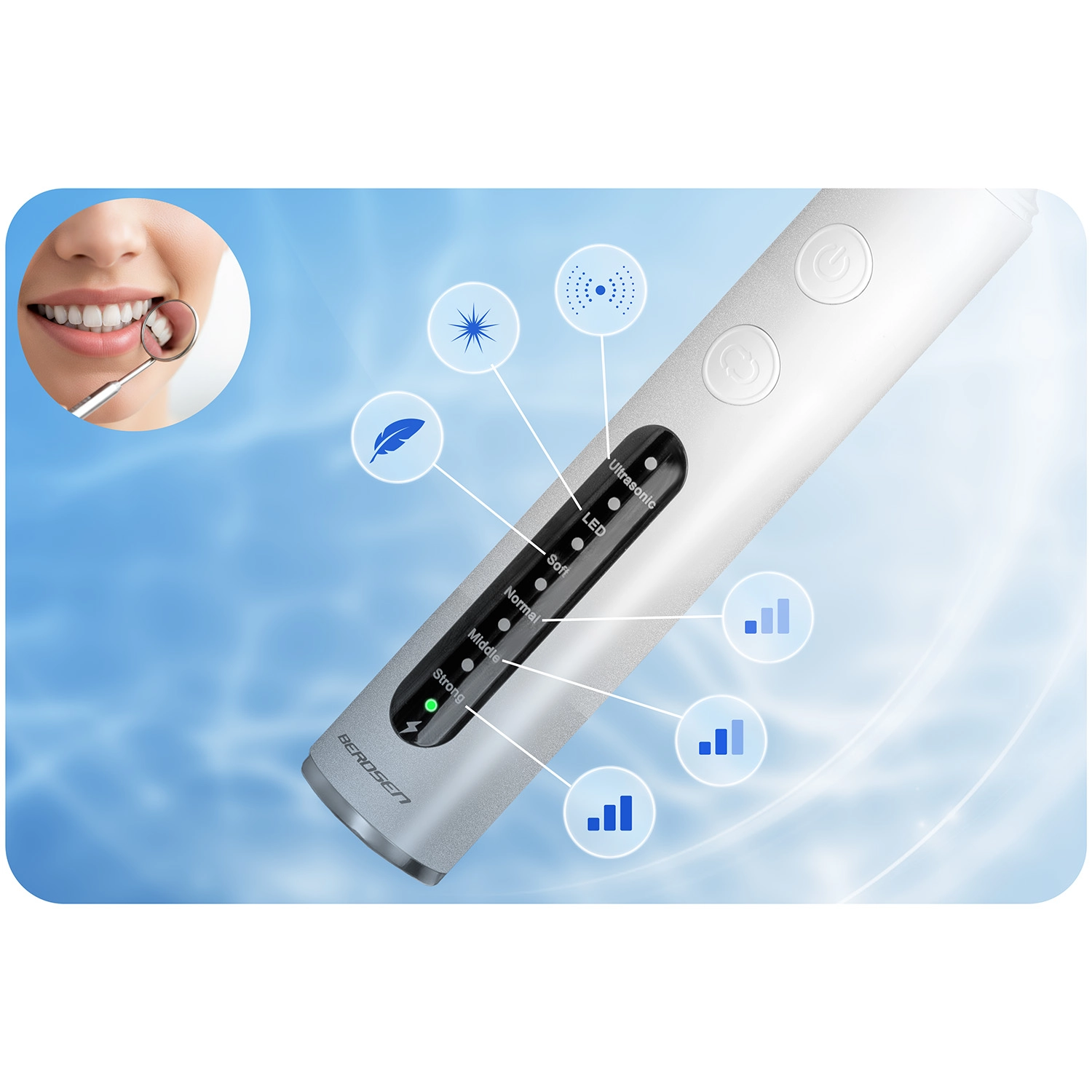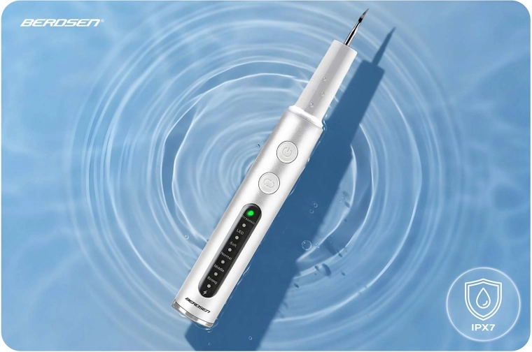 Curățare profesională a dinților acasă – scalerul BERDSEN BD-251 combină tehnologia sonică și ultrasonică pentru îndepărtarea țintită a tartrului chiar și din zonele greu accesibile. Lumina LED îmbunătățește vizibilitatea, în timp ce senzaorul de oprire de siguranță se oprește automat la atingerea țesuturilor moi (gingii/limbă) pentru siguranță maximă.
