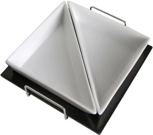 Set de servire stilat cu două boluri triunghiulare din ceramică pe o tăviță din lemn, ideal pentru sosuri, nuci, măsline sau dressinguri. Mânerele din oțel inoxidabil facilitează transportul, iar bolurile sunt compatibile cu mașina de spălat vase. Tăvița se curăță simplu, prin ștergere cu o cârpă umedă.