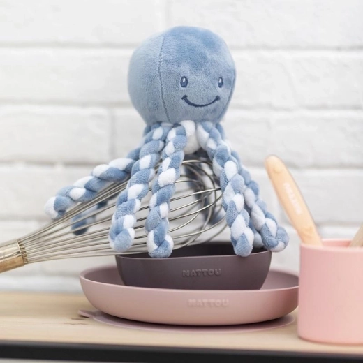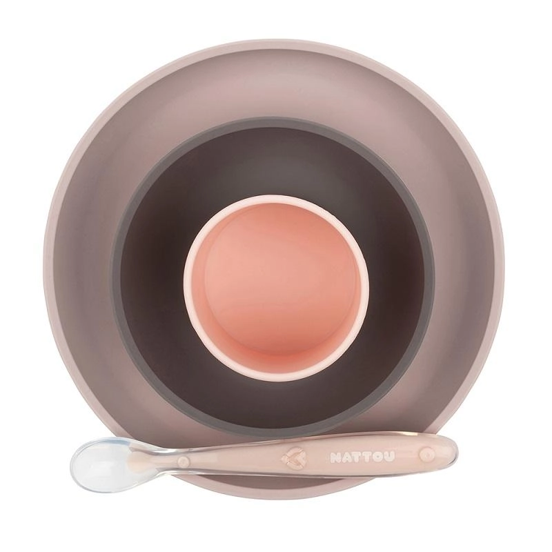 Practic, setul de masă din 4 piese din silicon moale de la Nattou ușurează primele piureuri și alimentația independentă. Conține un farfurioară și un bol cu ventuză anti-alunecare, un pahar și o linguriță moale, blândă cu gingiile. Datorită marginilor interioare rotunjite, mâncarea se ia ușor; siliconul este rezistent, indestructibil și fără BPA, potrivit pentru mașina de spălat vase și pentru utilizare zilnică.