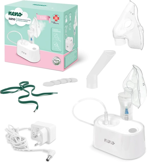 - Inhalator Neno Sano, mască pentru copii, mască pentru adulți, piesă bucală, recipient pentru medicament, furtun de aer 150 cm, 2× filtru de aer de schimb, adaptor de alimentare, manual de utilizare