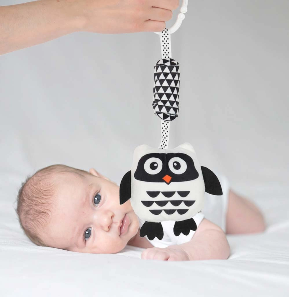 Această jucărie suspendată contrastantă în formă de bufniță este concepută ținând cont de nevoile nou‑născuților. Contrastul puternic dintre negru și alb atrage privirea copilului și sprijină dezvoltarea timpurie a vederii. Materialele moi, plăcute la atingere, și execuția sigură asigură o explorare confortabilă și în siguranță.