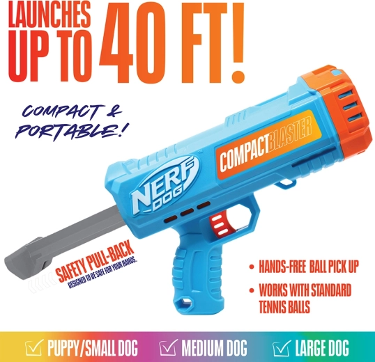 Pregătește-te, țintește și aport! cu blasterul NERF DOG, care lansează mingiuțe până la 12 metri și oferă câinelui tău un antrenament grozav fără efort pentru brațul tău. Datorită dimensiunilor compacte, este ușor de folosit, transportat și depozitat și permite ridicarea igienică a mingiuțelor fără a folosi mâinile. Pachetul include 2 mingi de tenis rezistente de dimensiune standard 2,5".
