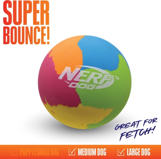 Distracție pentru câini activi cu mingea NERF DOG Super Bounce cu diametrul de 9,5 cm. Cauciucul rezistent cu săritură înaltă asigură ricoșeuri dinamice și imprevizibile, care motivează câinele la alergare și aport. Culorile vii cresc vizibilitatea pe iarbă și în parc, iar suprafața ușor de spălat facilitează întreținerea.