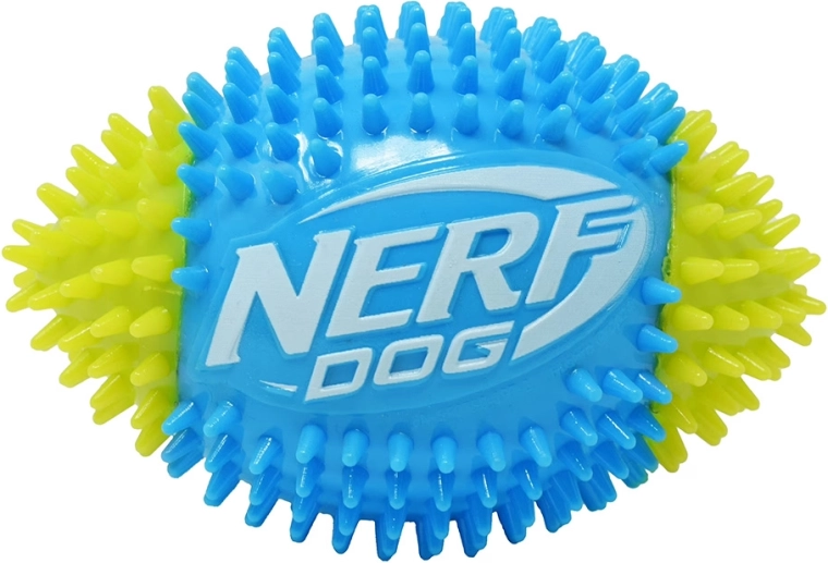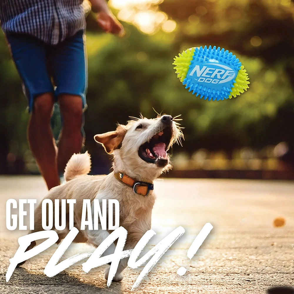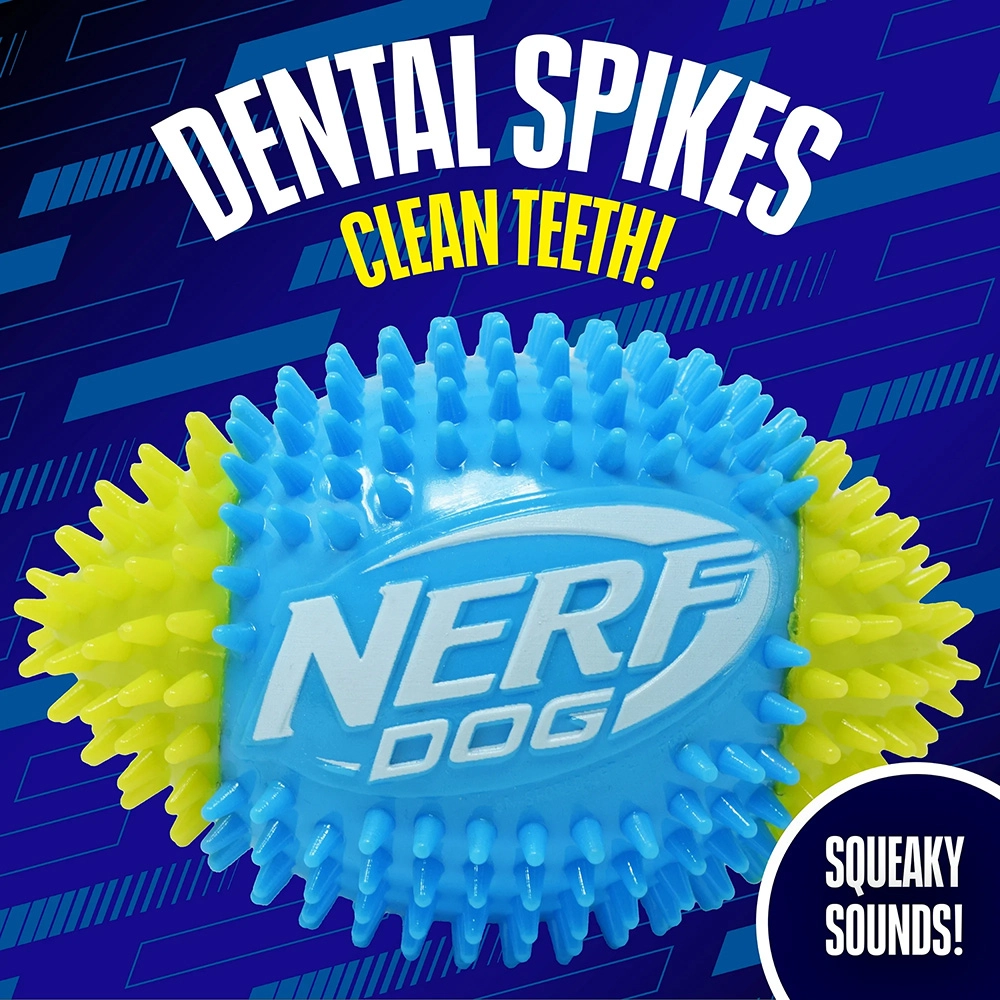 Jucăria Nerf Dog minge de fotbal care piuie cu țepi oferă distracție interactivă dinamică pentru câinii care iubesc mișcarea. Cauciucul termoplastic (TPR) asigură elasticitate, durată de viață îndelungată și grijă pentru dinți. Suprafața texturată cu țepi îmbunătățește priza la aport și, în același timp, susține mestecatul natural și masează gingiile.