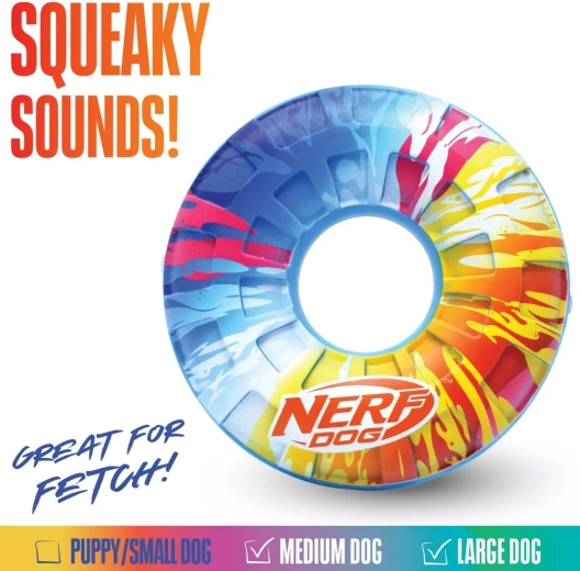 Inelul zburător cu sunet Nerf Dog este conceput pentru câinii activi care iubesc aportul. Cauciucul termoplastic (TPR) flexibil și rezistent, blând cu dinți, asigură distracție sigură și de durată. Datorită culorilor vii, inelul este ușor de văzut atât în zbor, cât și la aterizare, facilitând regăsirea și un joc cursiv.