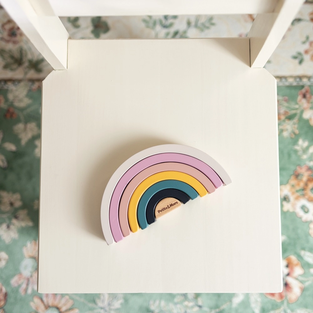 Datorită materialului robust și formei ergonomice, curcubeul este plăcut la atingere și rezistent pentru joaca de zi cu zi. Culorile pastelate motivează învățarea culorilor și a dimensiunilor și, totodată, completează frumos camera copilului. Jucăria este ideală pentru joaca individuală sau în grup și îmbină în mod natural distracția cu educația.