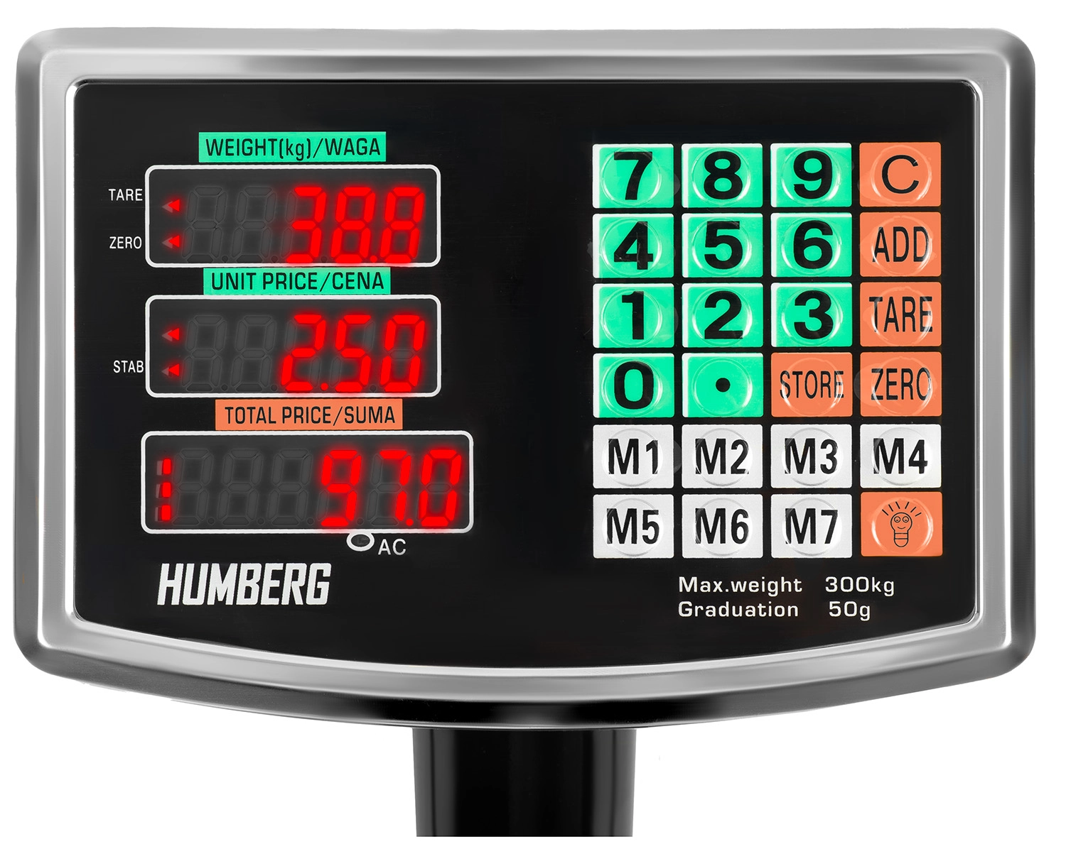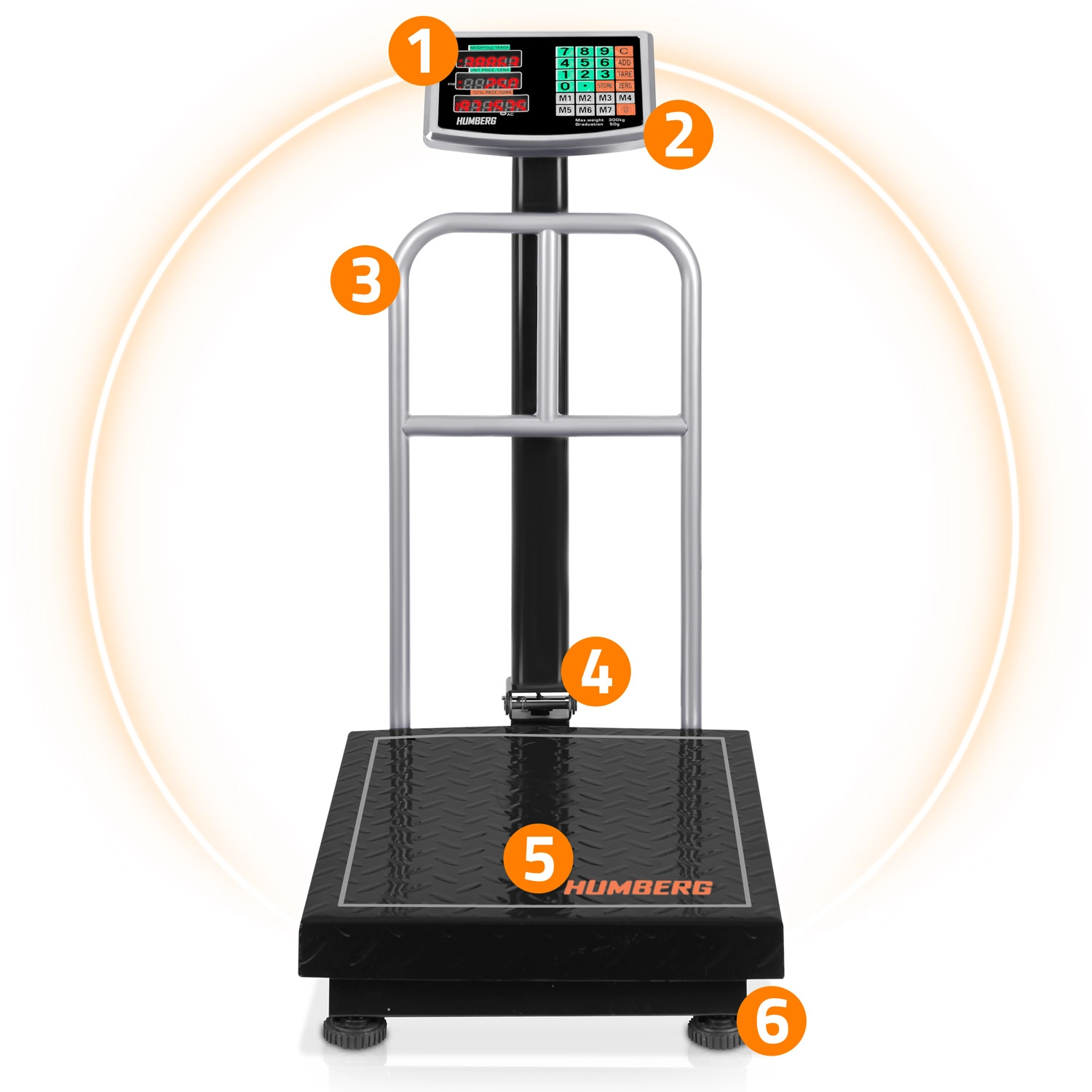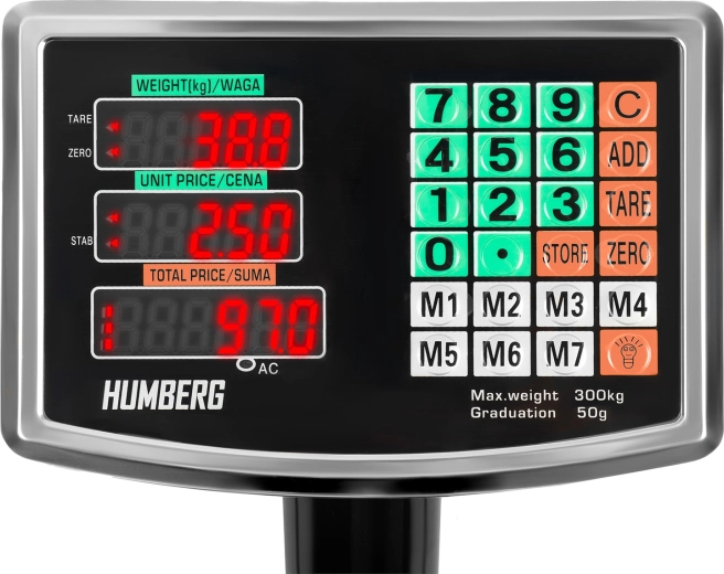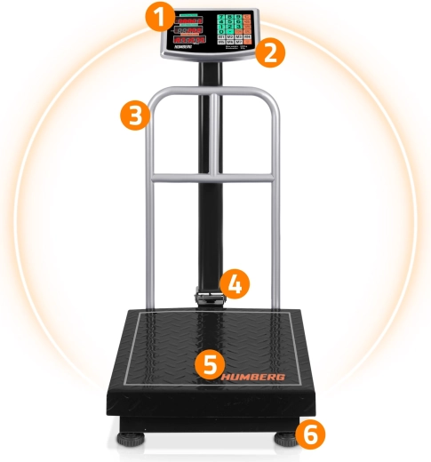 Afișajul triplu iluminat este perfect lizibil, iar tastatura funcțională include, printre altele, memorie pentru până la 7 prețuri și modul de numărare a pieselor (1–99). Datorită avertizării la suprasarcină, pornirii/opririi automate și picioarelor reglabile, operarea este rapidă și sigură. Alimentarea este asigurată de adaptorul de rețea sau acumulatorul de 6 V 4Ah pentru utilizare mobilă fără acces la priză.