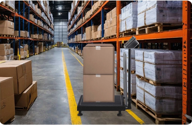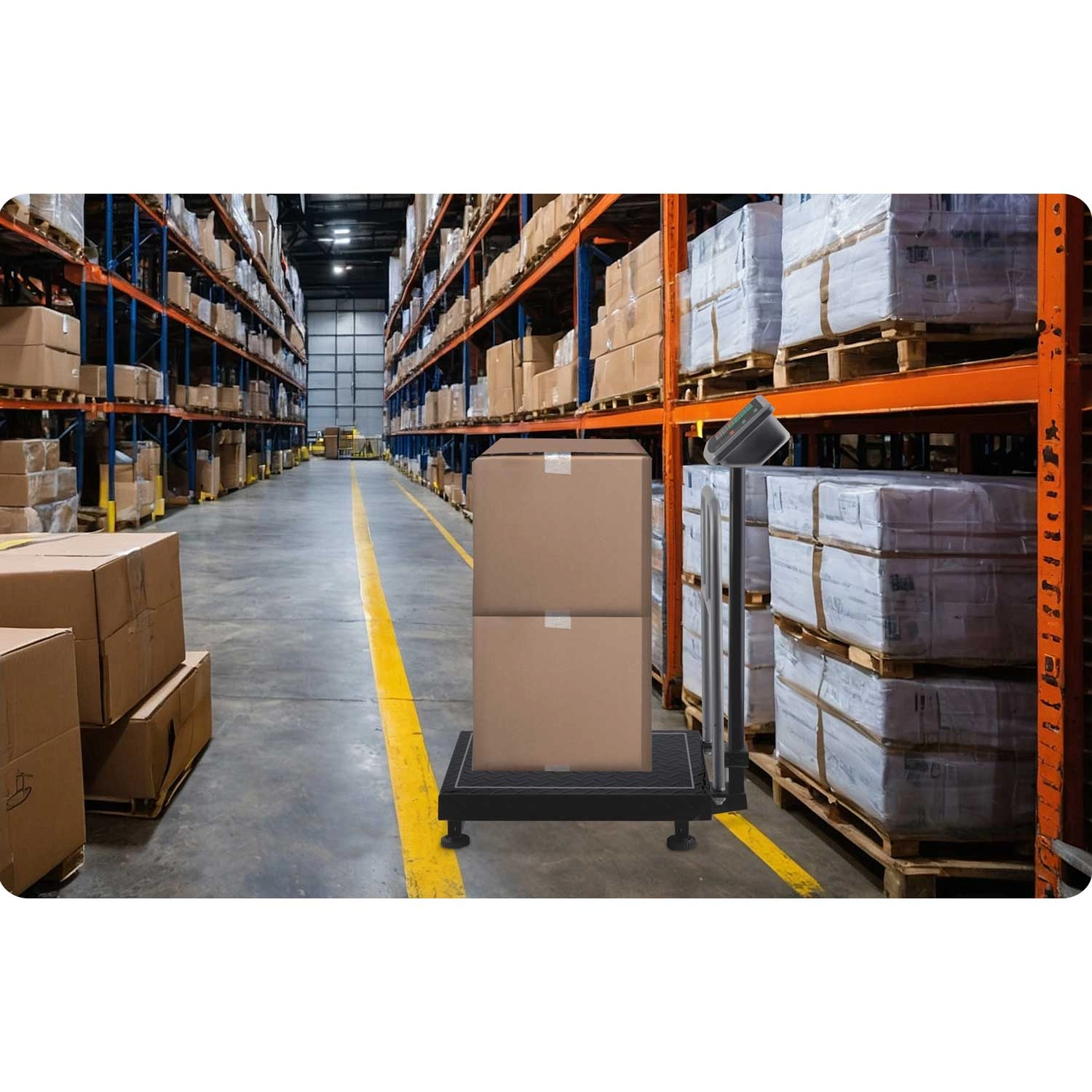 Detalii practice precum mânerul/suportul pentru încărcături mai înalte sau instabile, conturul evidențiat pentru distribuirea uniformă a greutății și mecanismul pliabil eficientizează munca, scurtează timpul de manipulare și reduc erorile la cântărire.