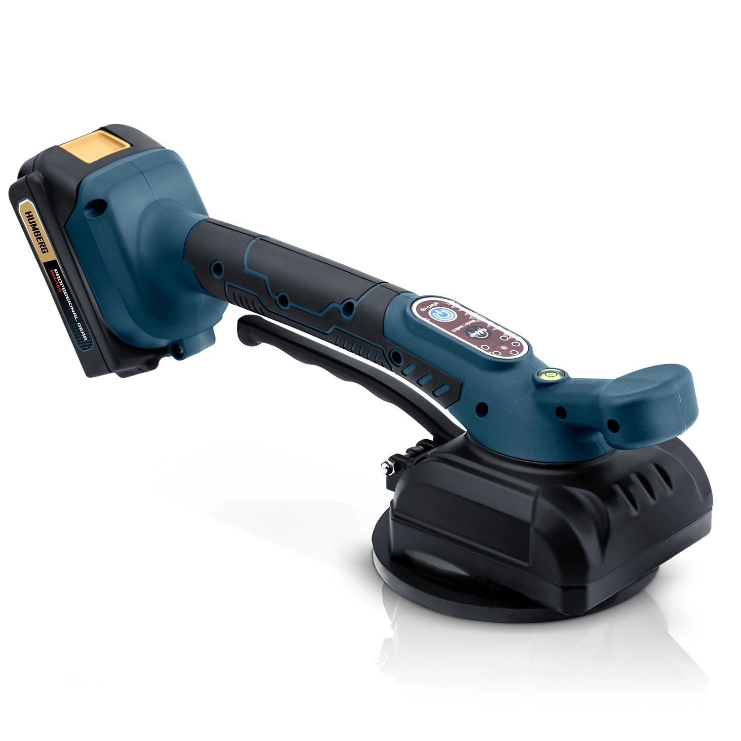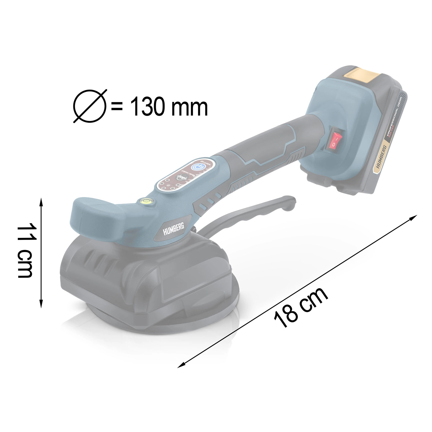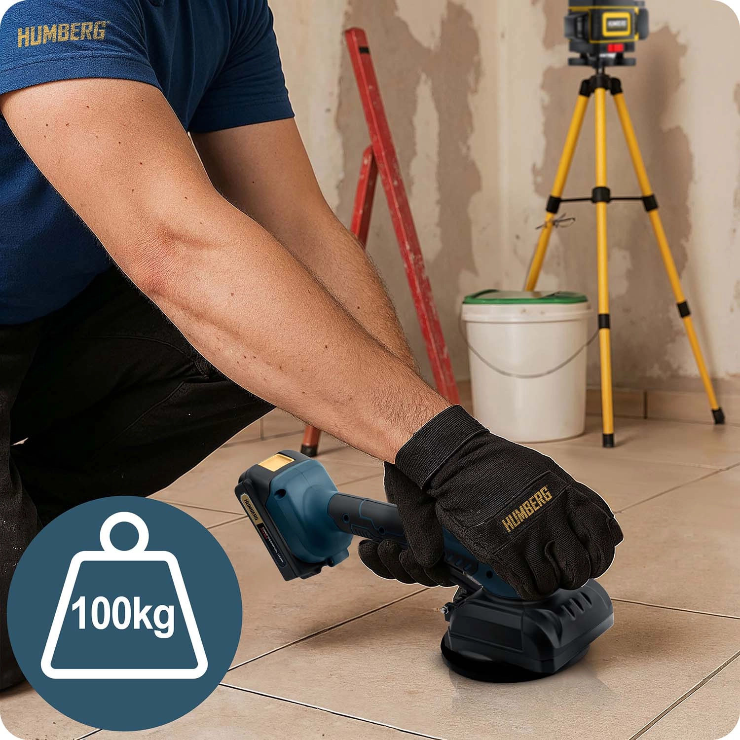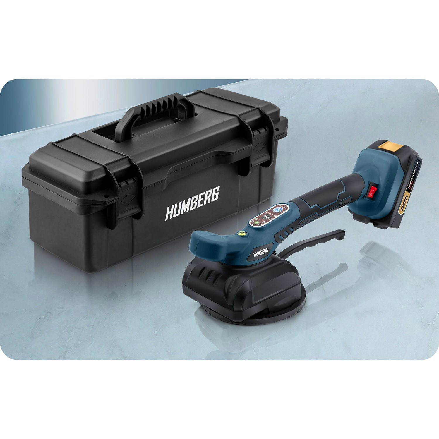 Ventuză profesională electrică cu vibrații pentru plăci ceramice HUMBERG cu capacitate de încărcare de până la 100 kg care accelerează montajul și transportul plăcilor standard și de format mare. Oferă 5 niveluri de vibrații pentru poziționare precisă, autonomie lungă de până la 240 de minute cu două acumulatori și încărcare rapidă în 4–5 ore. Datorită vidului puternic, nivela integrată și sistemelor avansate de siguranță lucrați mai rapid, mai precis și fără riscul deteriorării materialului.