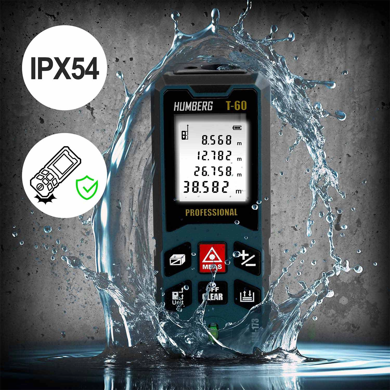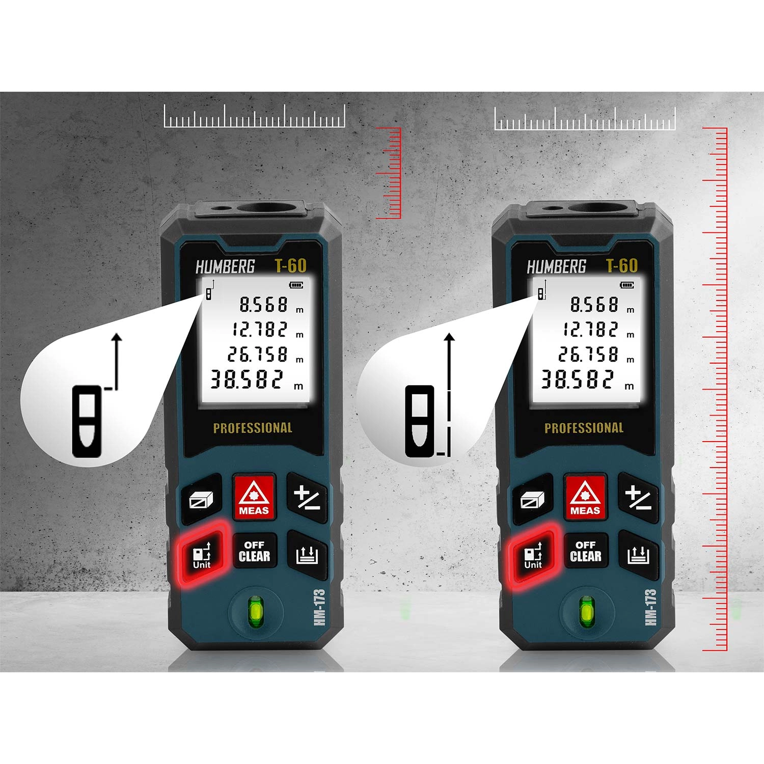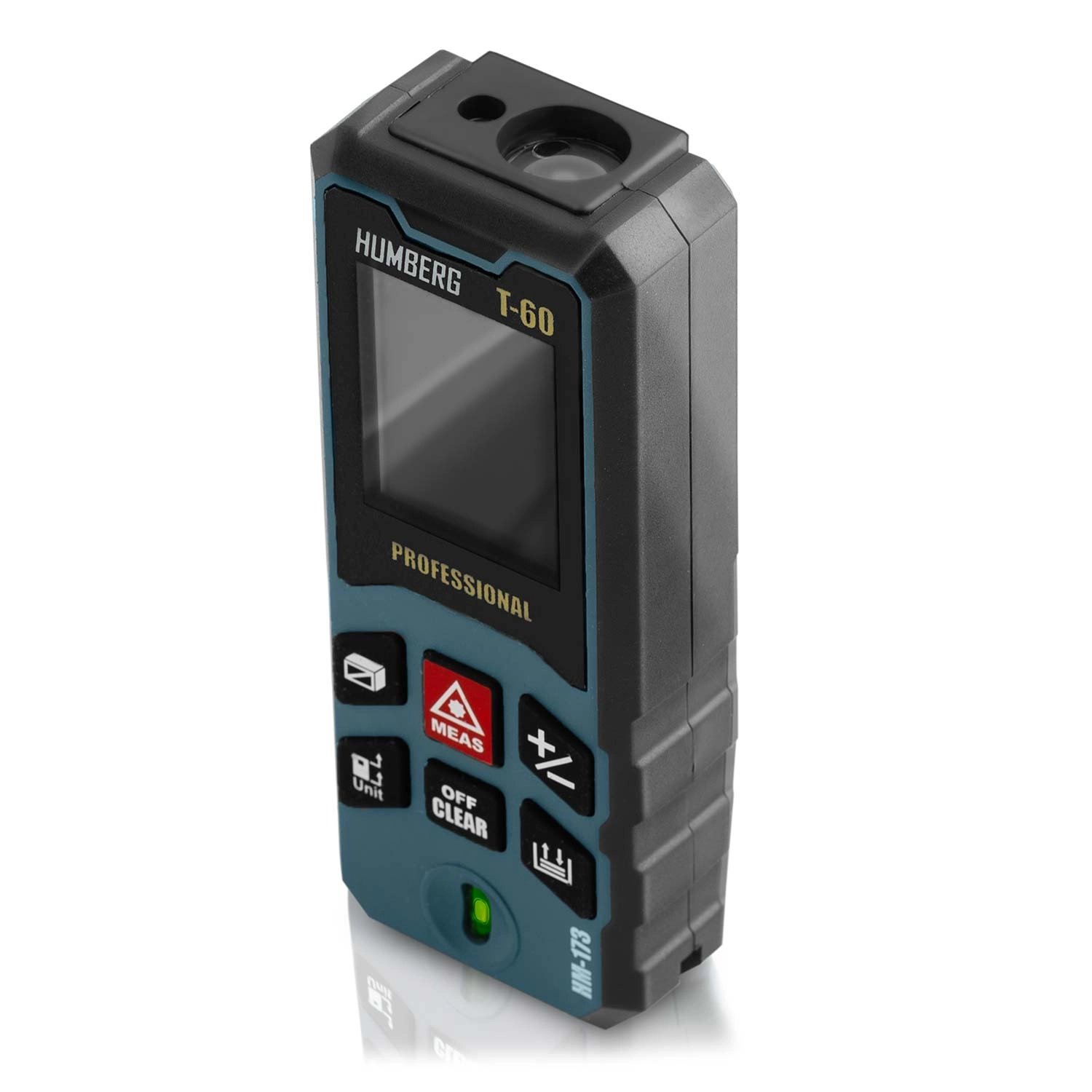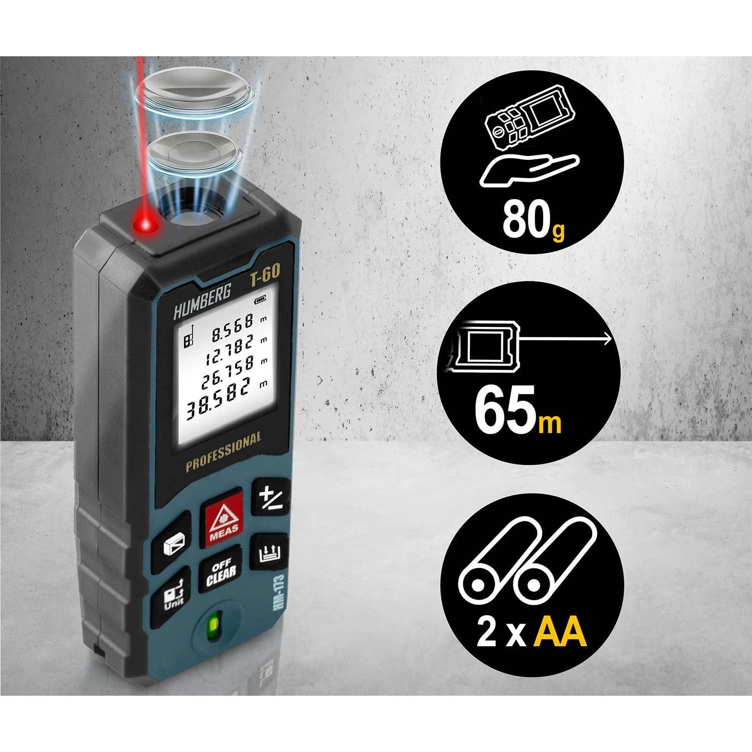 Telemetrul laser profesional HUMBERG T-60 combină fiabilitatea, operarea simplă și dimensiunile compacte. Măsoară distanțe în intervalul 0,05–60 m (max. 65 m) cu o precizie de ±1,5 mm și calculează instant suprafața, volumul și înălțimea indirectă prin metoda lui Pitagora. Ecranul mare asigură o citire ușoară a valorilor atât în interior, cât și în exterior.