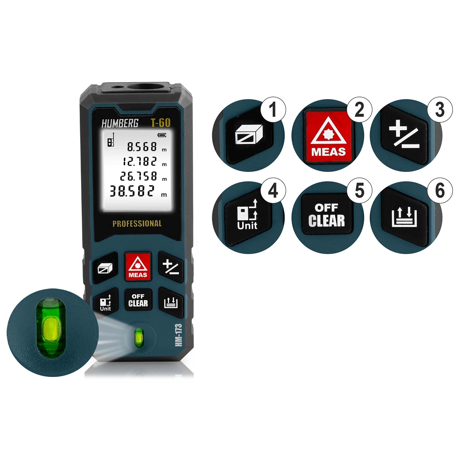 Telemetrul laser HUMBERG T-60 măsoară în intervalul 0,05–60 m (max. 65 m) cu o precizie de ±1,5 mm. Ecranul mare și clar facilitează citirea rapidă chiar și în lumină slabă.