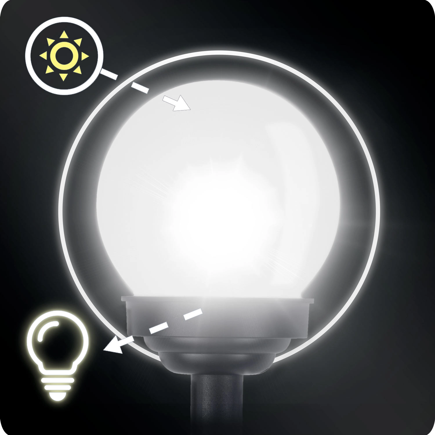Transformați-vă grădina într-un loc de poveste. Cele patru sfere solare pe țăruși se instalează ușor în gazon sau în straturi, iar datorită senzorului de lumină se aprind automat la întuneric. Panoul solar amorf face față și condițiilor de iluminare mai slabe, iar acumulatorul Ni‑MH de 150 mAh asigură o iluminare plăcută a aleilor și a zonei de relaxare pe înserat.
