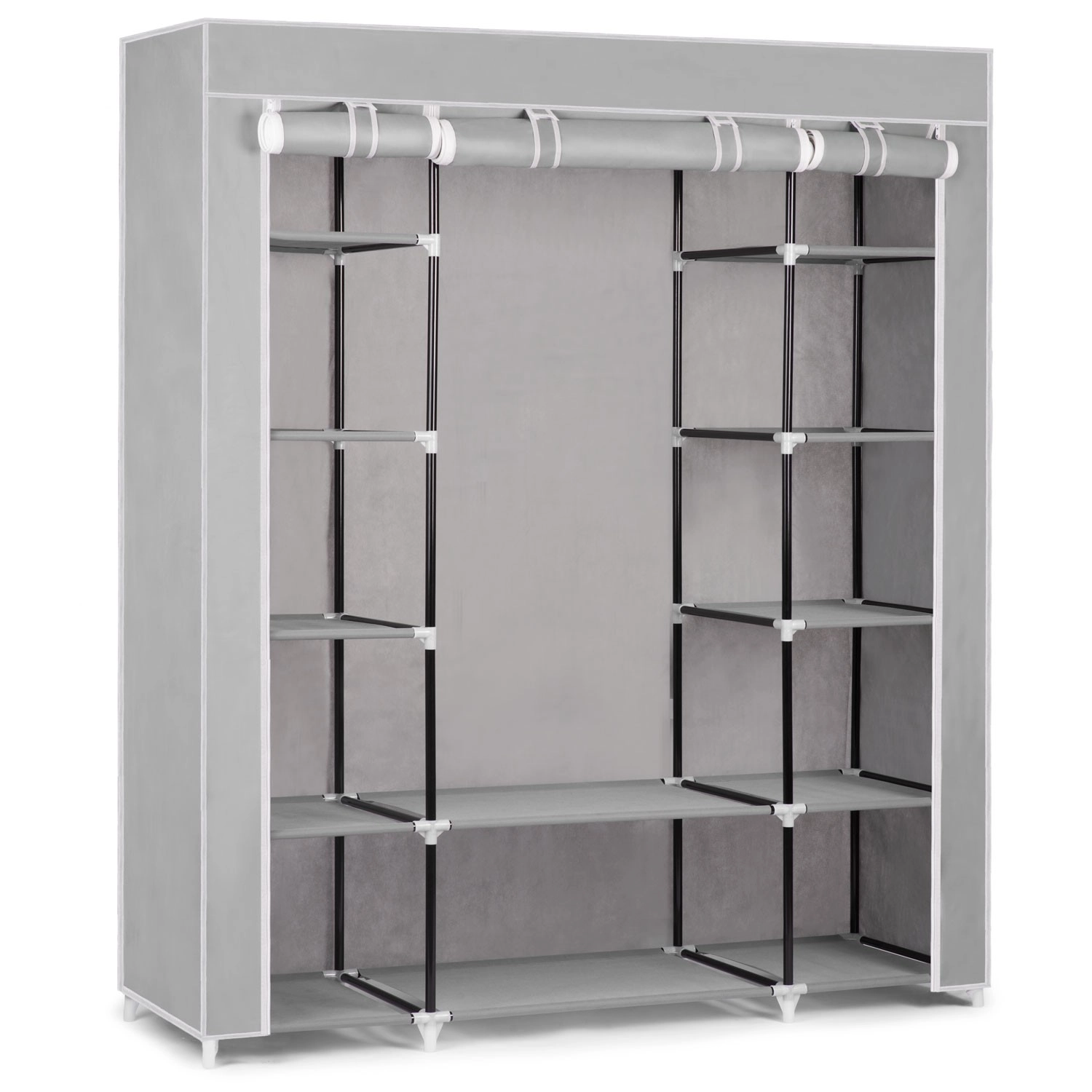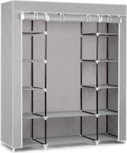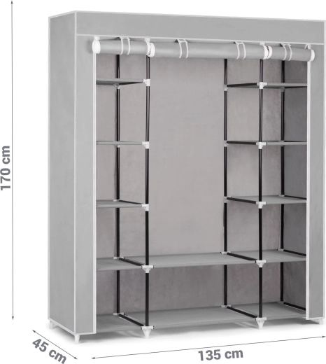 Dulapul textil practic și încăpător Massido, în eleganta culoare gri, oferă 12 rafturi solide, bară pentru umerașe și structură din oțel pentru durabilitate ridicată. Trei secțiuni separate, cu patru fermoare, asigură acces comod și depozitare ordonată. Montaj ușor și intuitiv, realizabil în câteva clipe.
