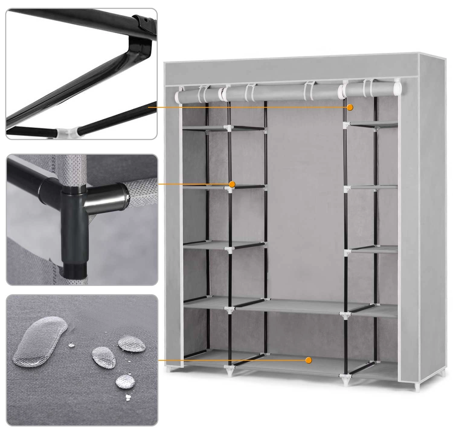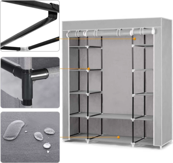 Dulapul textil Massido – gri este soluția ideală pentru dormitoare, dressinguri, holuri și camere de studenți. Cadrul din oțel rezistent, cu conectori PP solizi, și husa impermeabilă asigură o durată lungă de viață chiar și la utilizare zilnică. Datorită organizării bine gândite a rafturilor și barei pentru umerașe, vei depozita cu ușurință haine, accesorii și încălțăminte.