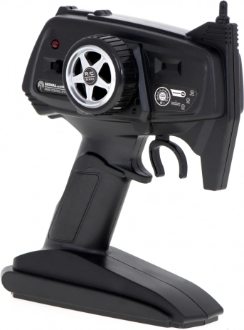 Pachetul include un emițător 2,4 GHz pentru control stabil și fără interferențe. Modelul este alimentat de acumulator, iar telecomanda necesită 4× AA 1,5 V. Dimensiunile de 48 × 27 × 25 cm oferă un raport ideal între manevrabilitate și trecerea prin teren.