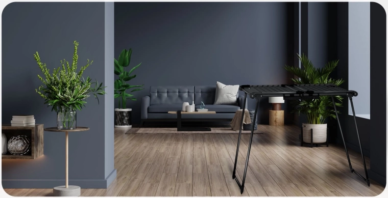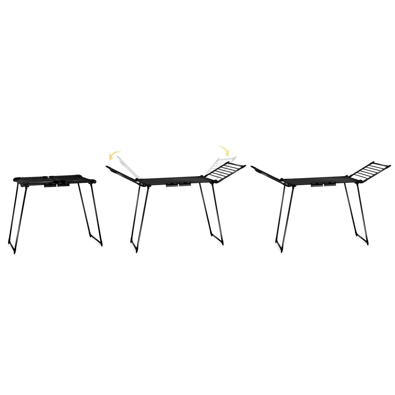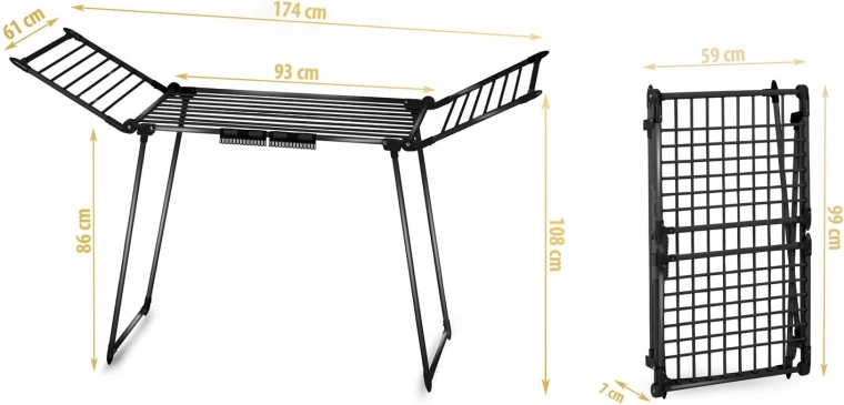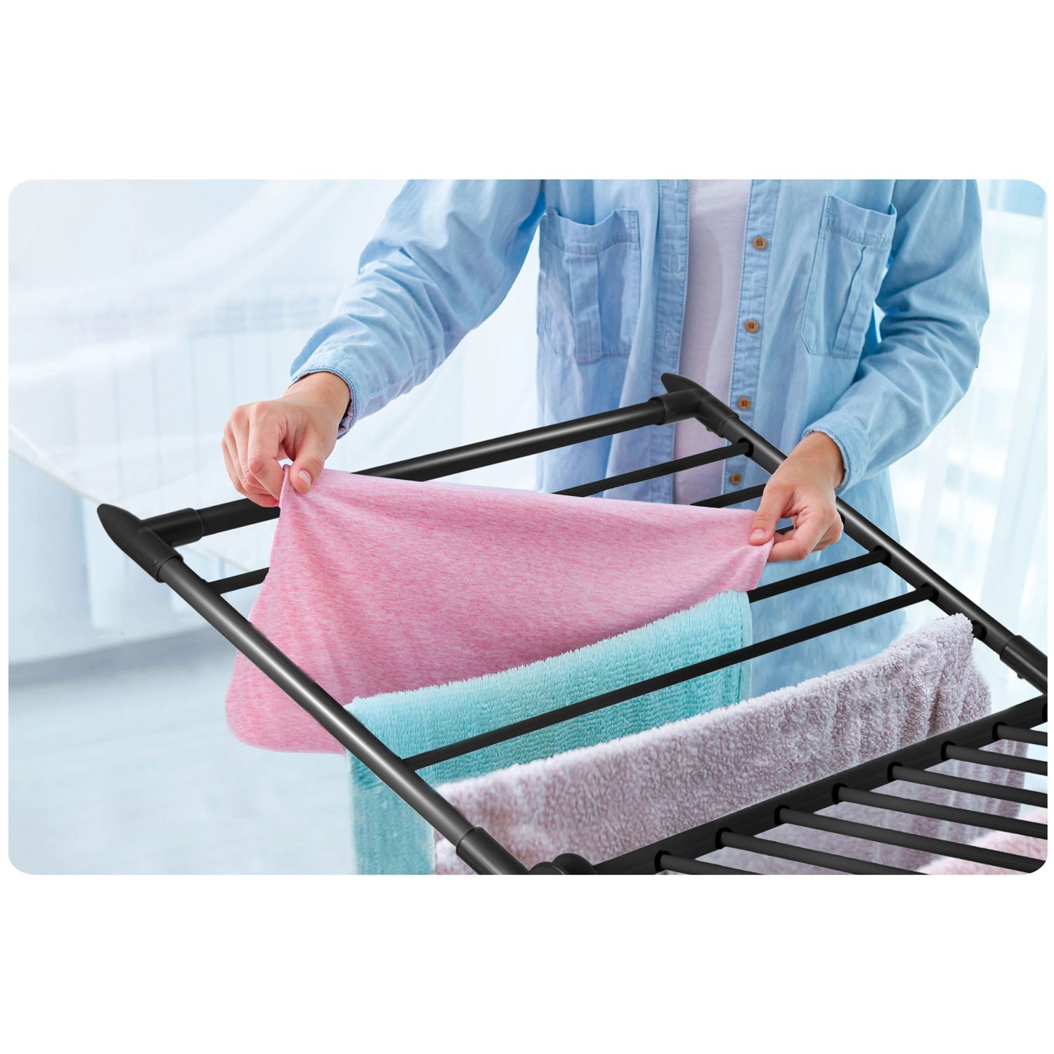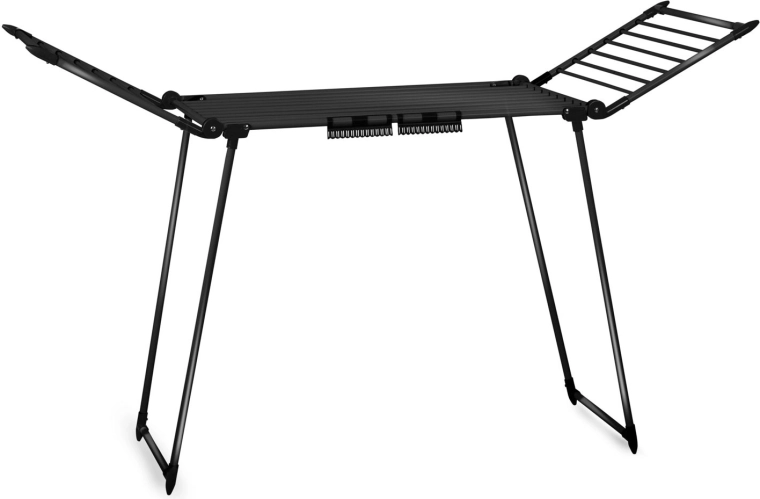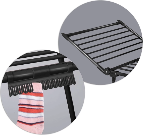 Barele mai groase ajută la reducerea formării cutelor, astfel încât, adesea, nu mai este nevoie de călcat după uscare. Suporturile pentru lenjerie intimă și șosete economisesc spațiu pe tijele principale, iar picioarele antiderapante asigură stabilitate pe diverse suprafețe. Uscătorul se pliază și se desfășoară rapid, ocupând un spațiu minim când este strâns.