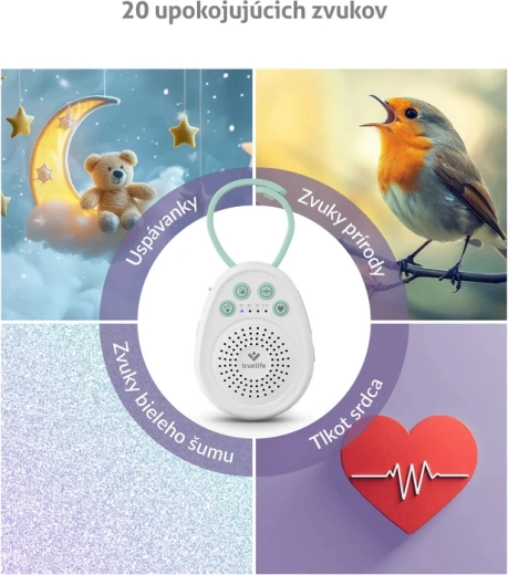 - 20 de sunete pentru adormire liniștită: 5 melodii, 9 sunete ale naturii, 5 zgomote albe și 1 bătaie de inimă.