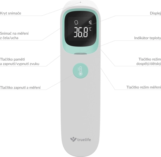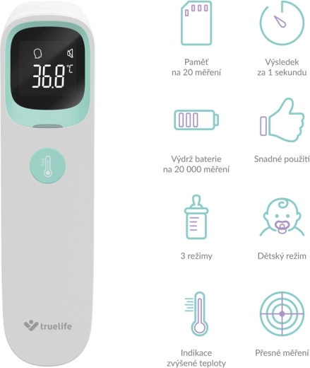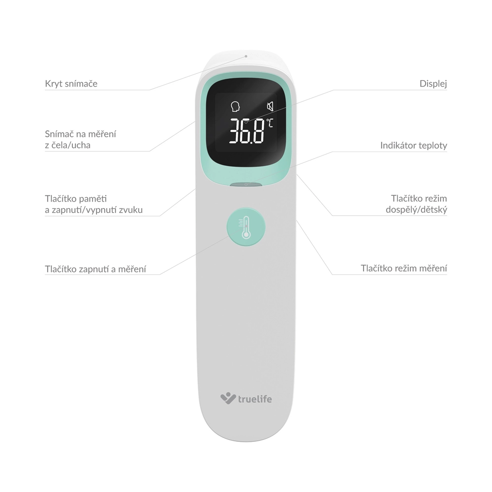 TRUELIFE Care Q9 este un termometru infraroșu modern, fără contact, care măsoară temperatura în 1 secundă cu o precizie ridicată. Datorită celor trei moduri, poate măsura temperatura corporală de pe frunte și din ureche, precum și temperatura obiectelor și a lichidelor – ideal pentru laptele praf al bebelușilor, baie sau băuturi. Indicatorul color de pe ecran avertizează instantaneu asupra temperaturii crescute, chiar și pe întuneric.