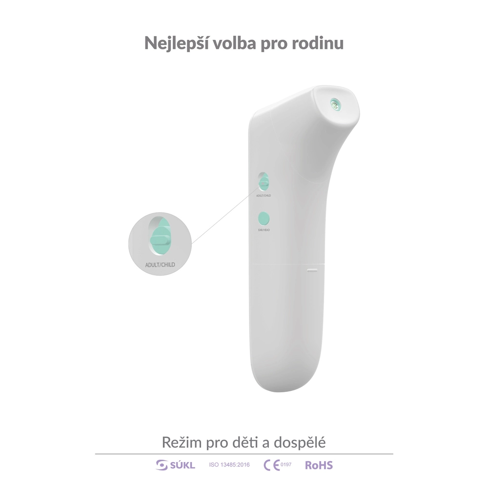 Pentru familiile cu copii există modul pentru copii pentru persoanele sub 12 ani. Măsurarea este complet igienică și confortabilă – este suficient să îndreptați de la o distanță de 1–3 cm și să apăsați un singur buton. Termometrul memorează ultimele 20 de valori și, datorită funcționării economice, poate realiza până la 20 000 de măsurători cu un singur set de baterii.