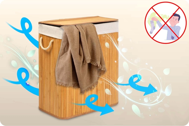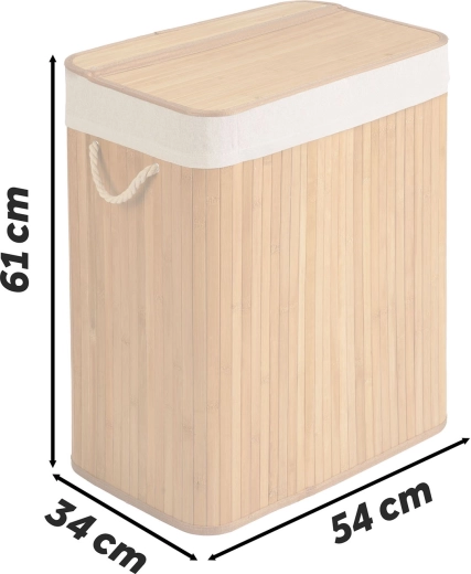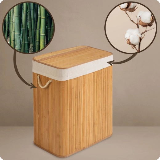 Materialele naturale – bambus și bumbac – favorizează circulația aerului și ajută la reducerea umidității și a mirosurilor. Sacul din bumbac detașabil se scoate ușor, se strânge cu șnur și se duce direct la mașină. Capacul practic, mânerele din frânghie și baza stabilă asigură durabilitate și manevrare ușoară.