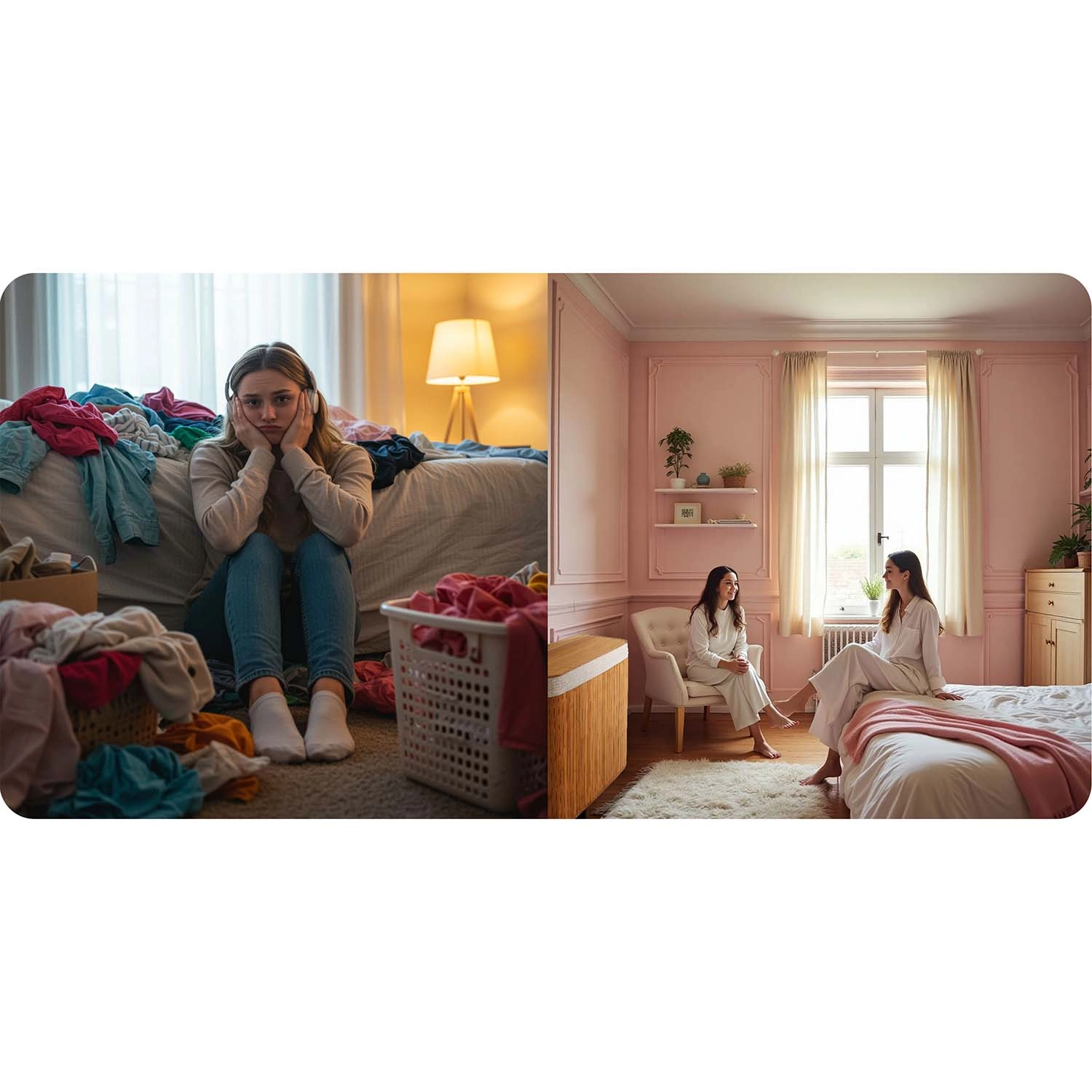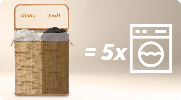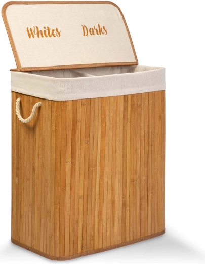 Coșul de rufe cu două compartimente din bambus natural îți ușurează sortarea zilnică – pe măsură ce pui rufele, le separi direct în Lights și Darks. Datorită capacității mari de 100 l, poate cuprinde rufe pentru mai multe spălări și păstrează baia sau dormitorul ordonate și curate.