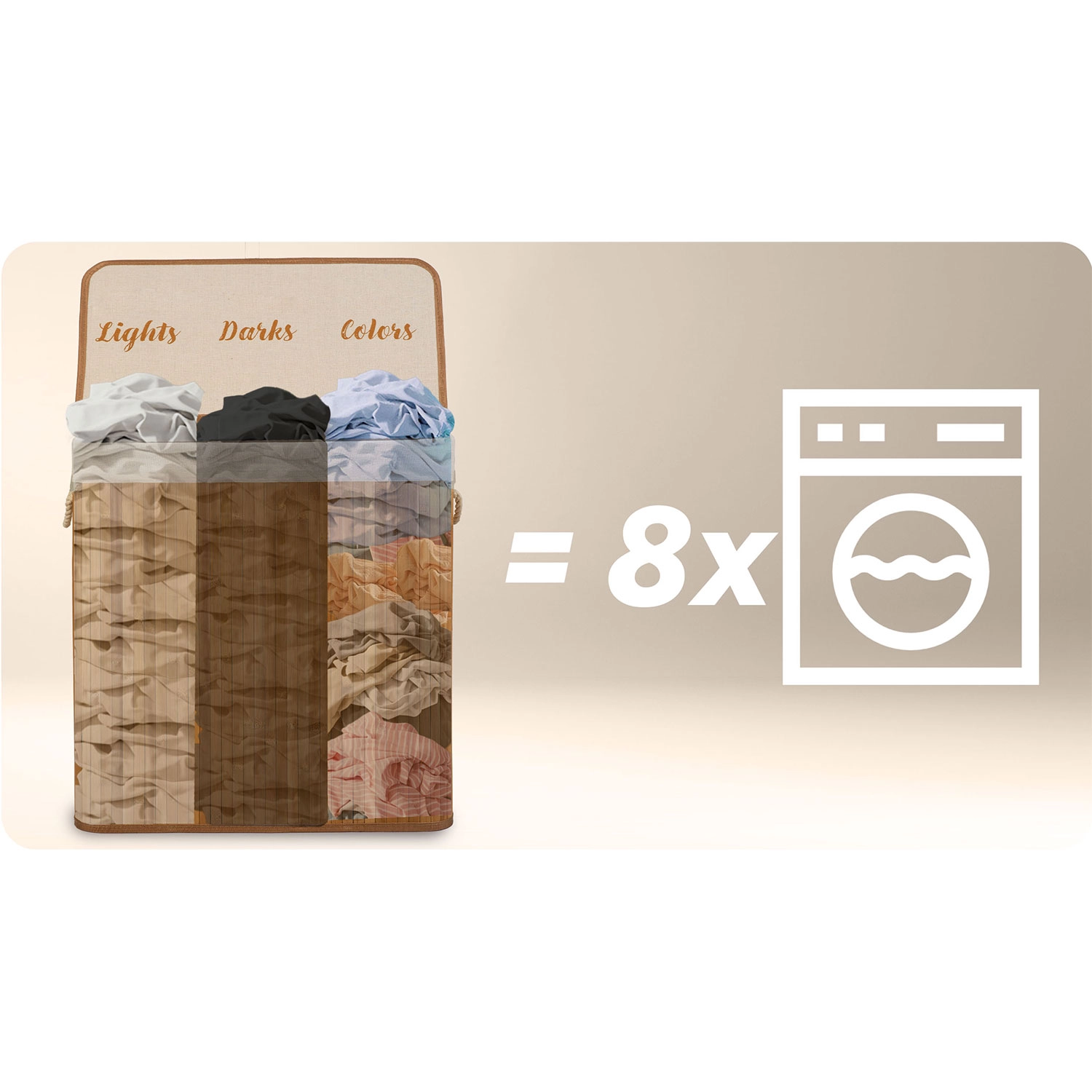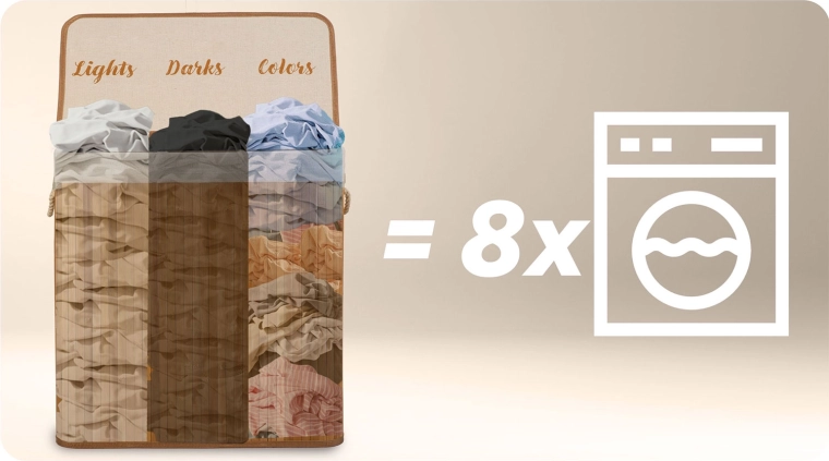 Practicitate maximă și sortare clară a rufelor într-un singur produs. Coșul oferă o capacitate de 150 de litri – încape conținutul a mai multor spălări – și trei secțiuni clar delimitate, cu marcaje practice pe interiorul capacului: Lights, Darks, Colors. Astfel economisiți timp și nervi chiar înainte de spălat.
