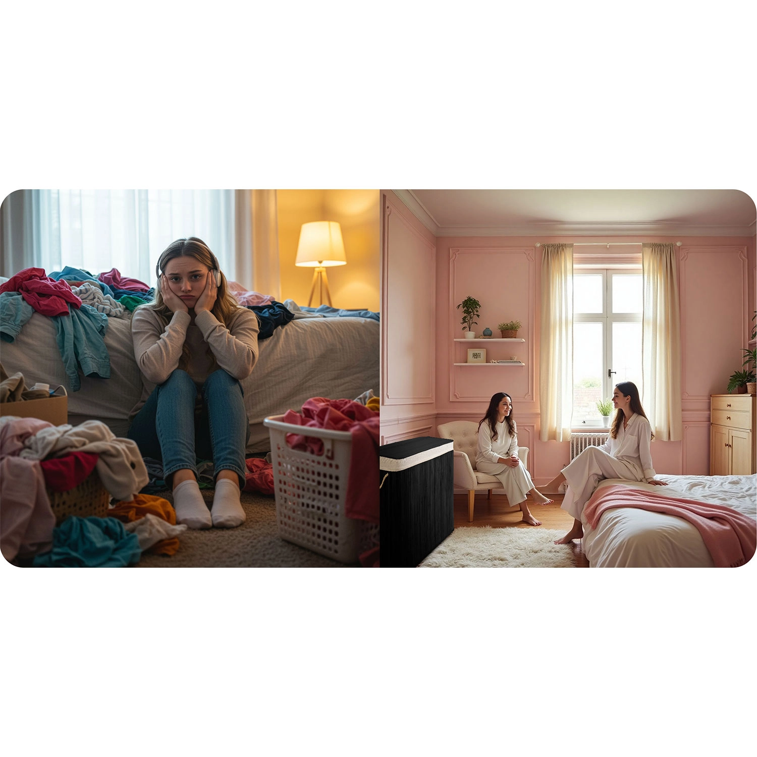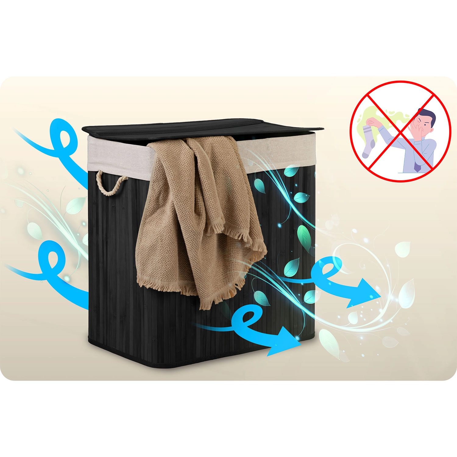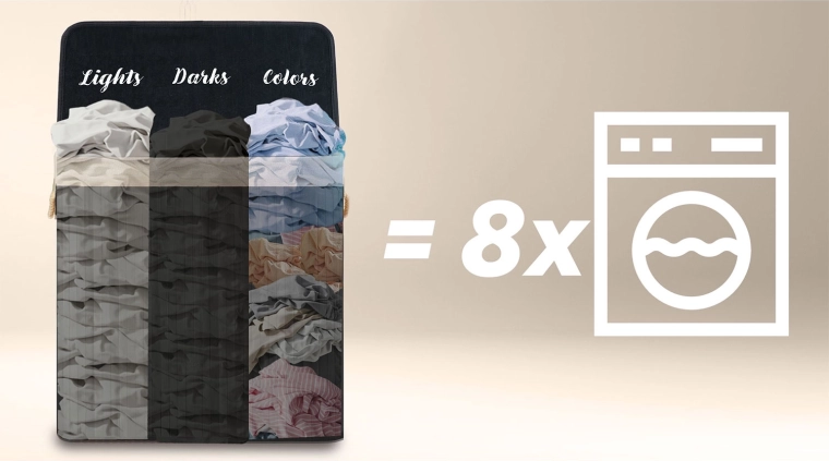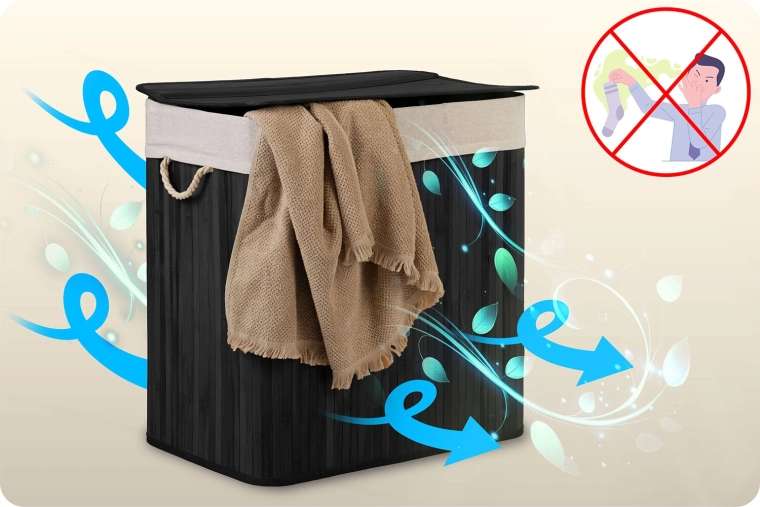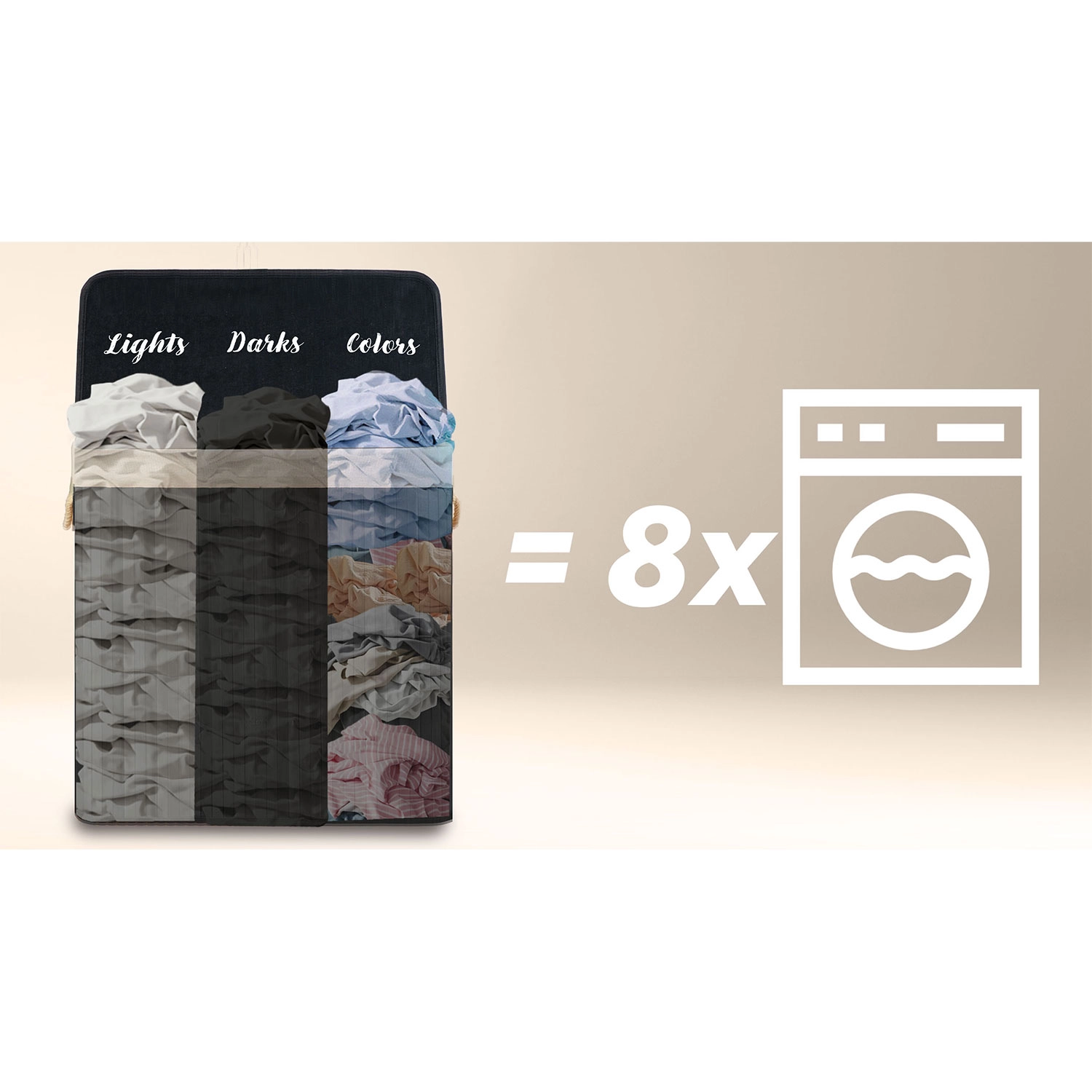 Descoperă soluția practică pentru sortarea zilnică a rufelor. Volumul generos de 150 litri poate cuprinde rufe din mai multe cicluri de spălare, iar marcajele clare Lights / Darks / Colors te scapă de sortarea îndelungată înainte de spălat. Materialele naturale – bambus și bumbac – favorizează circulația aerului și reduc mirosurile.