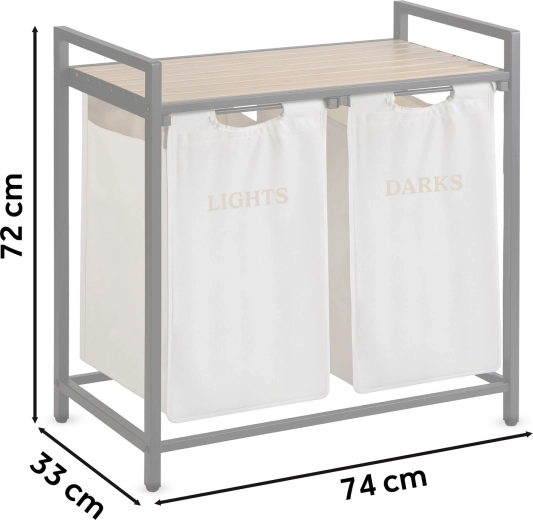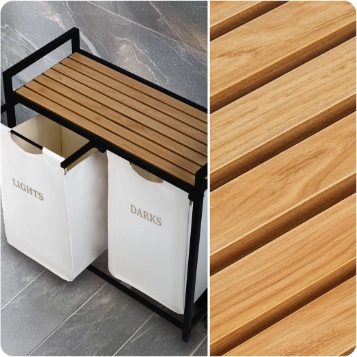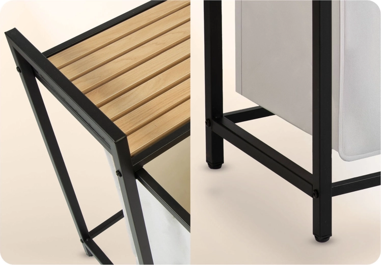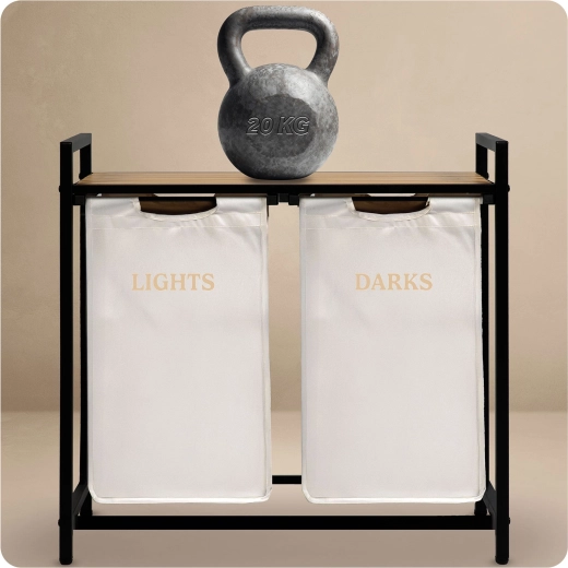 Coșul de rufe cu două compartimente, cu un aer industrial, aduce sortare practică și un aspect ordonat locuinței. Volumul de 80 litri găzduiește confortabil rufe pentru mai multe cicluri de spălare, în timp ce raftul superior din lemn natural oferă spațiu pentru detergenți, prosoape sau decorațiuni.