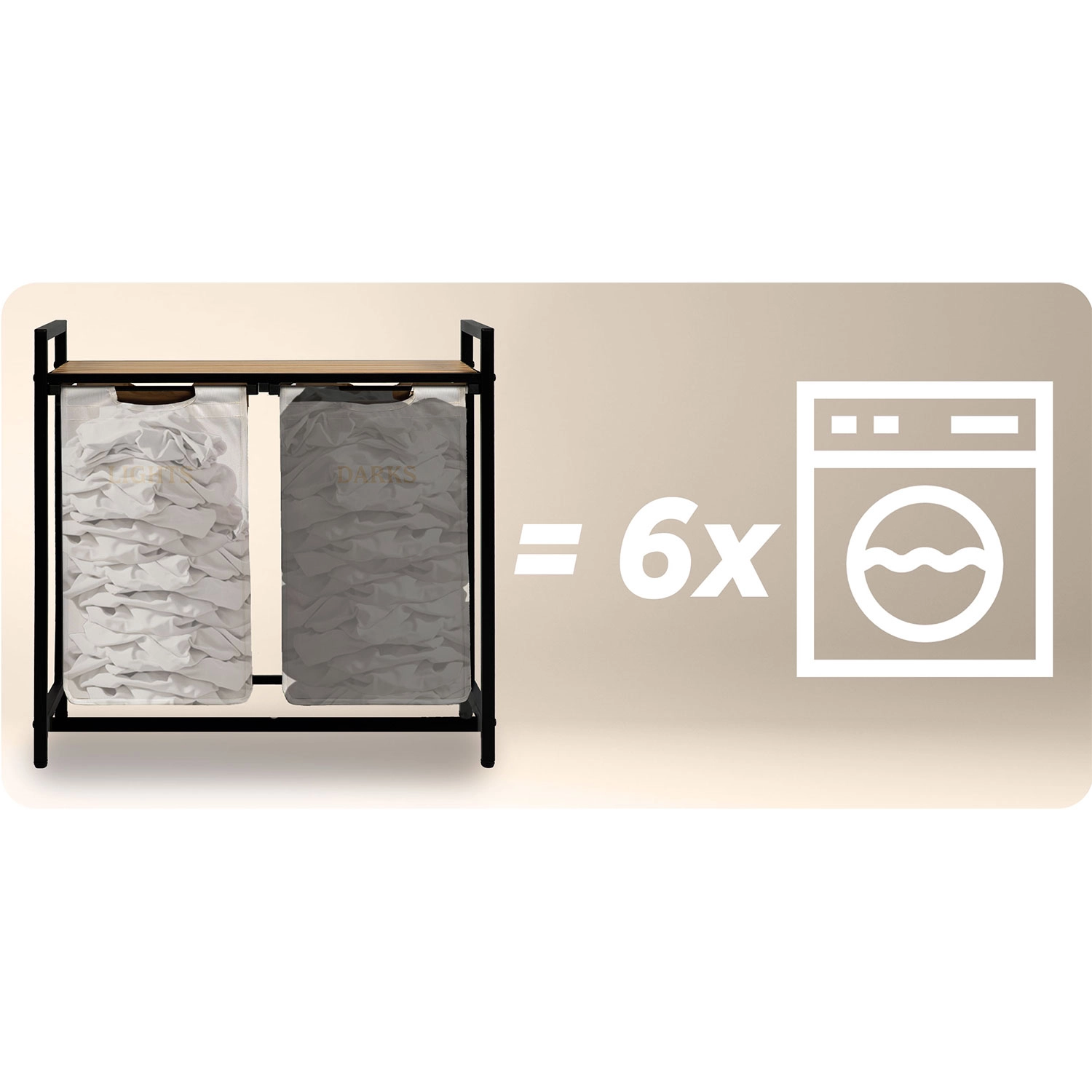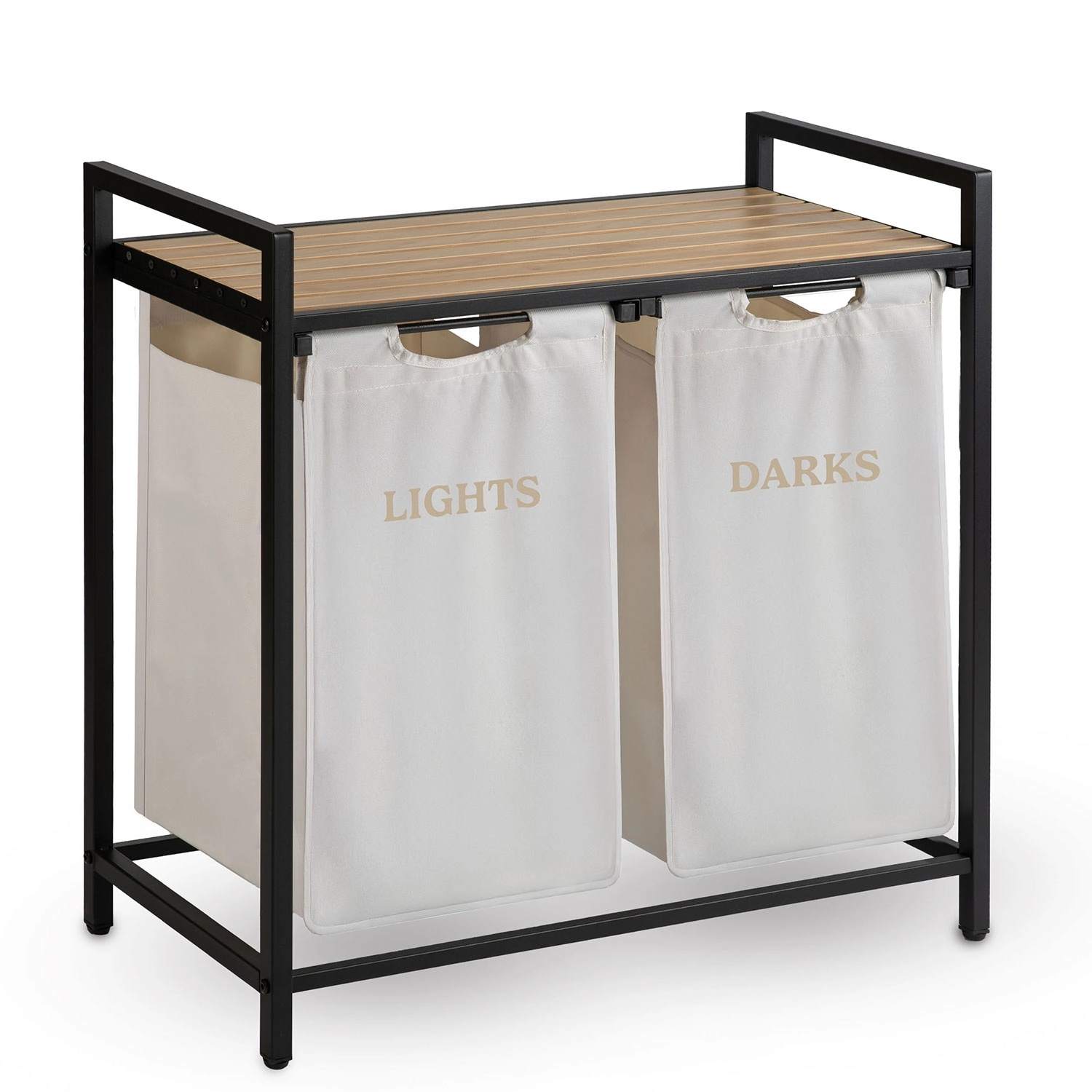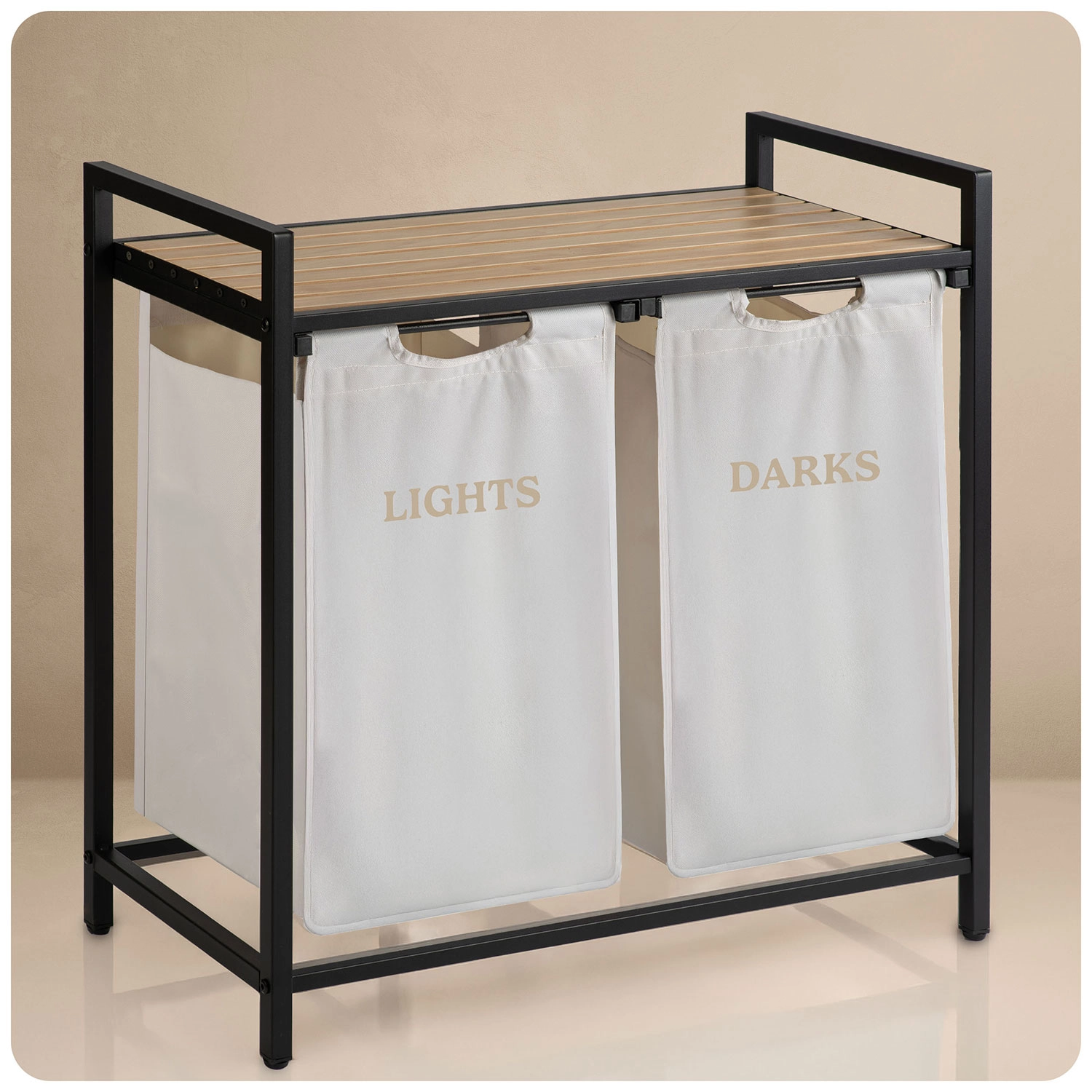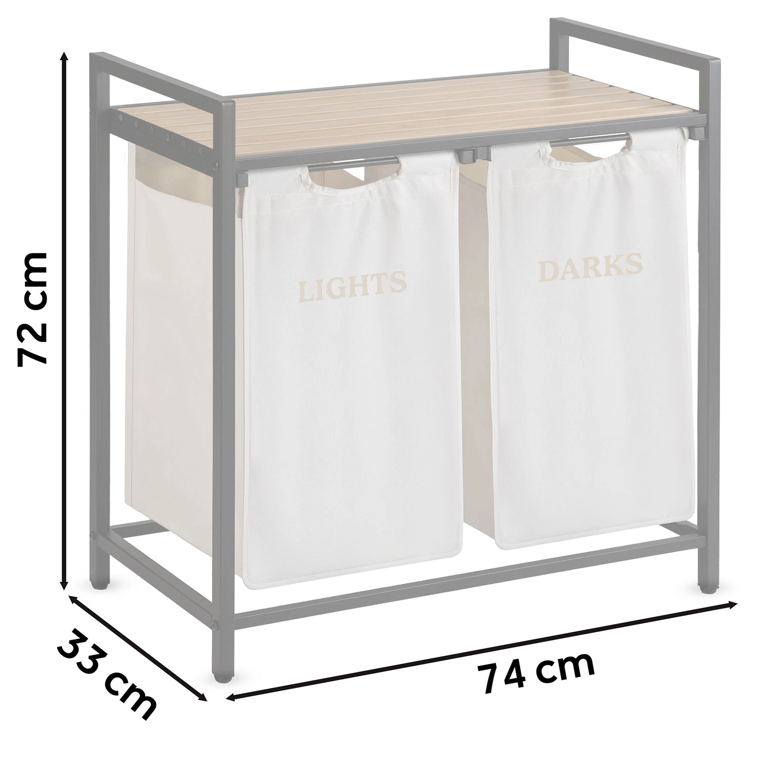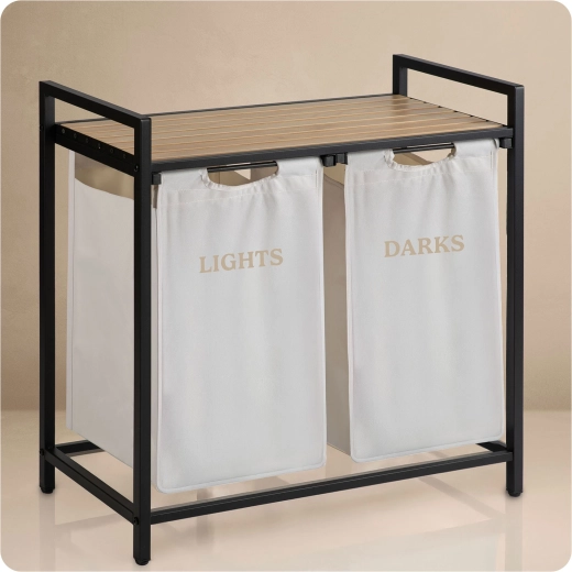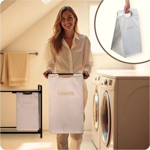 Stabilul cadru din oțel vopsit în câmp electrostatic rezistă la coroziune, zgârieturi și utilizare zilnică. Cei doi saci cu marcaje clare LIGHTS și DARKS economisesc timp la pregătirea spălării – pur și simplu scoateți sacii și îi transportați direct la mașina de spălat.