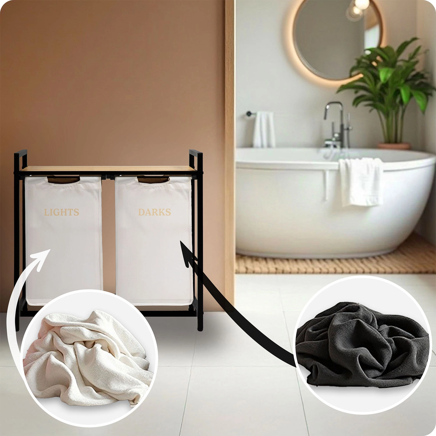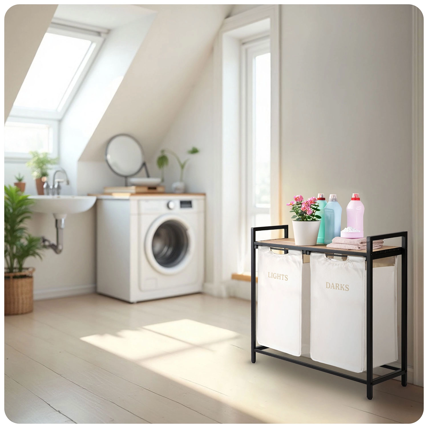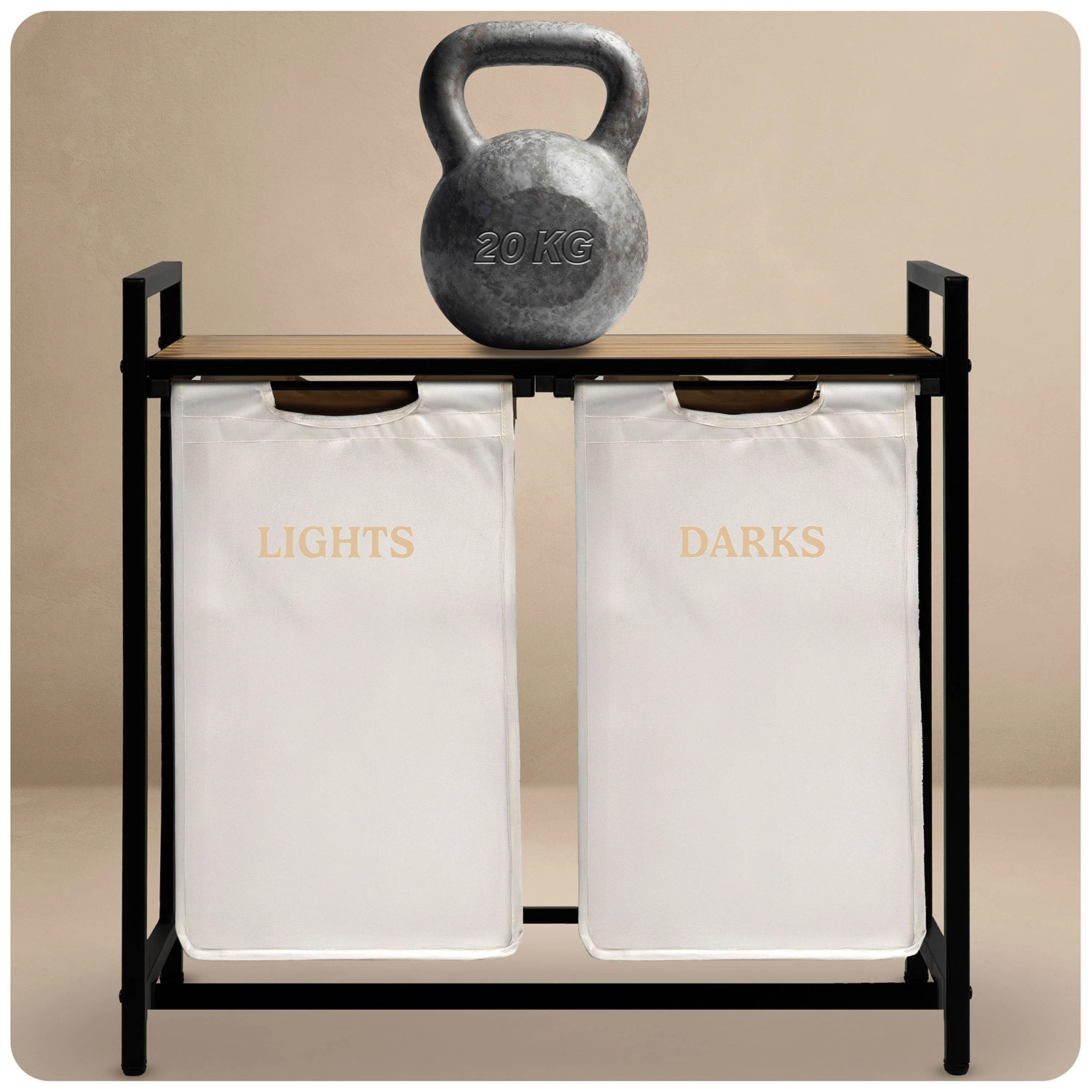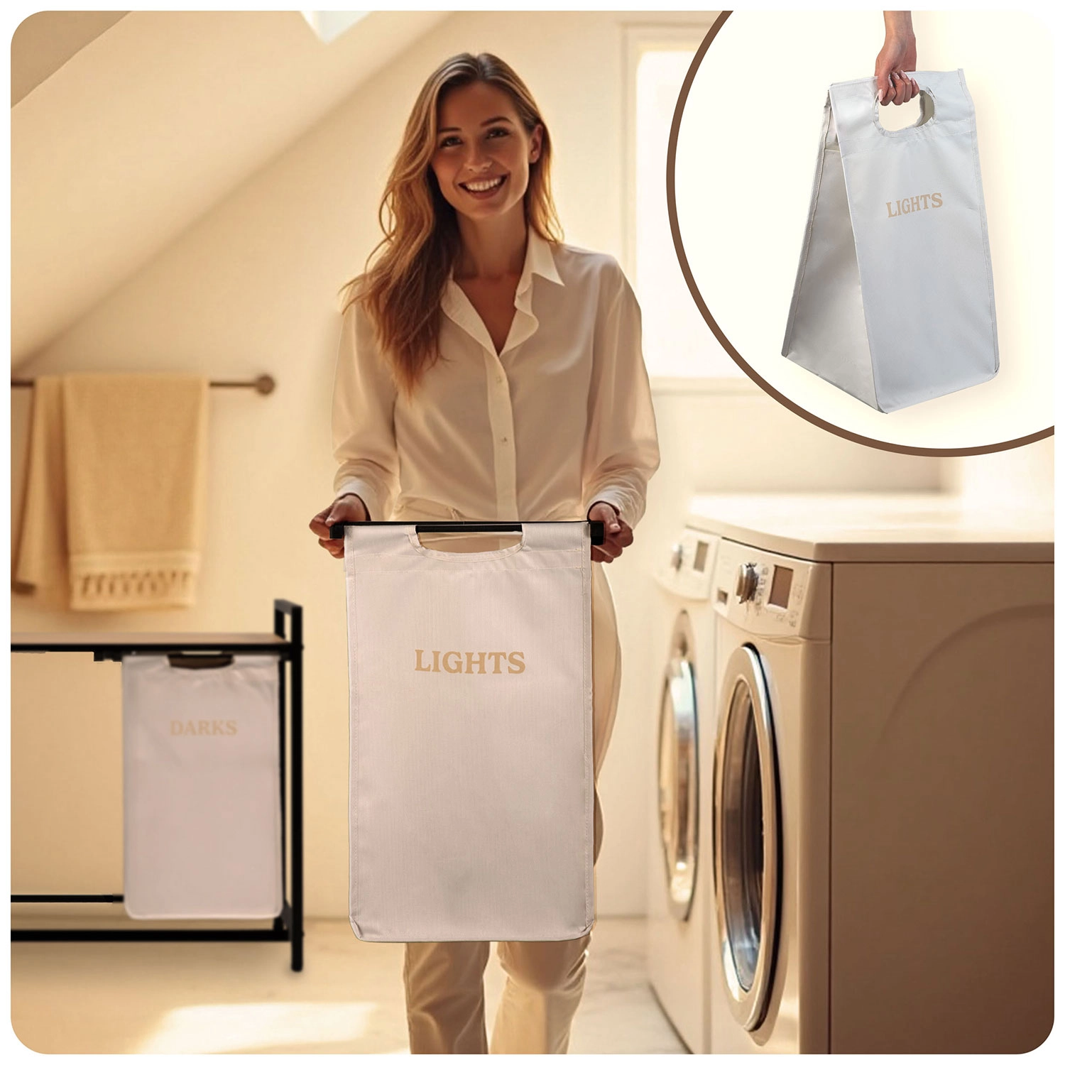 Stabilul cadru din oțel vopsit în câmp electrostatic rezistă la coroziune, zgârieturi și utilizare zilnică. Cei doi saci cu marcaje clare LIGHTS și DARKS economisesc timp la pregătirea spălării – pur și simplu scoateți sacii și îi transportați direct la mașina de spălat.