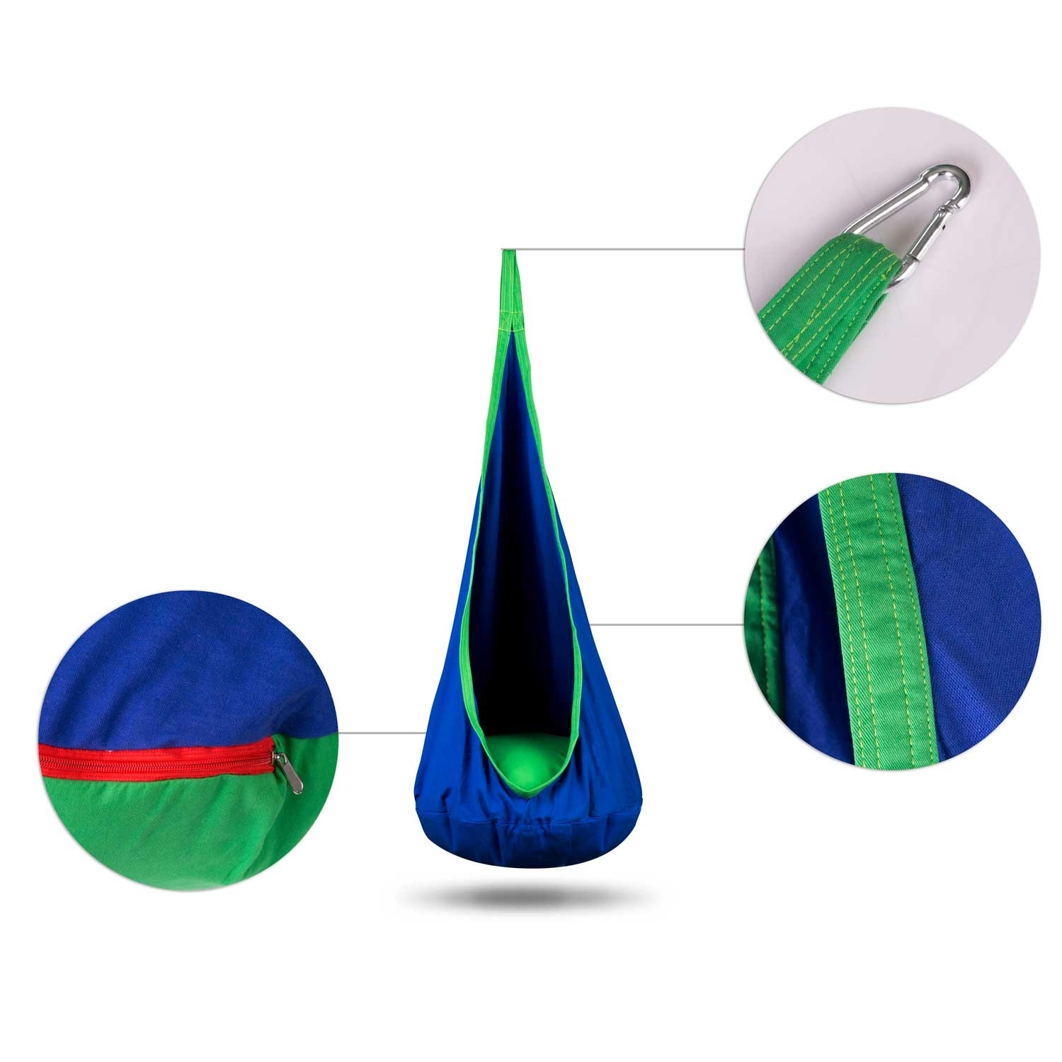 Husa practică cu fermoar permite scoaterea facilă și spălarea la mașină. Coconul este fabricat din textile rezistente, care suportă bine utilizarea zilnică. Pachetul include și cârlig/carabiniere de agățare, astfel încât instalarea este rapidă și fără griji.