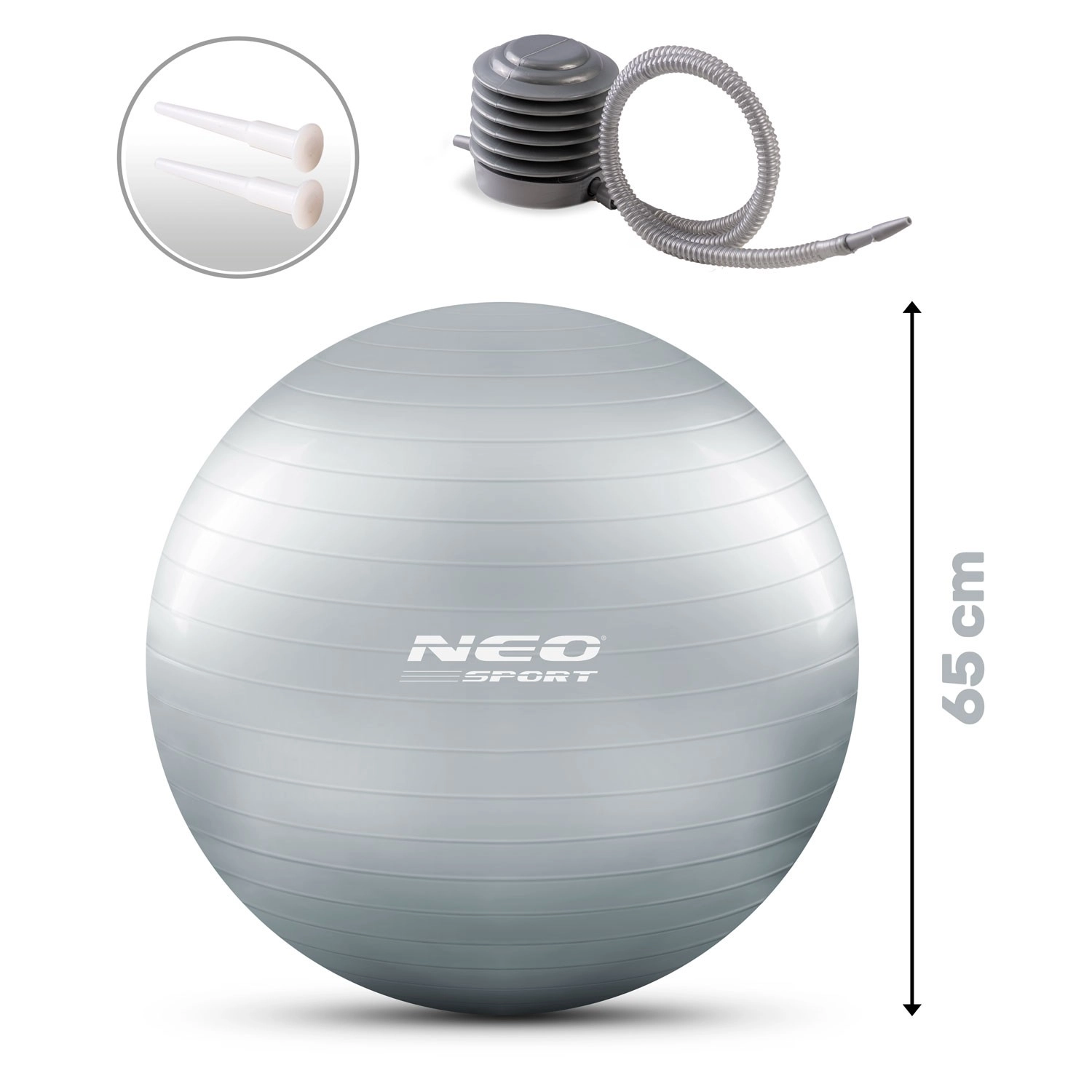 Mingea de gimnastică universală, cu diametrul de 65 cm, în culoare argintie, este ideală pentru antrenament acasă, recuperare și birou. Oferă sistem de siguranță anti-burst, suprafață antiderapantă pentru prindere sigură și stabilitate și este fabricată din PVC durabil, prietenos cu mediul. Pachetul include o pompă gratuită cu două duze pentru umflare rapidă.