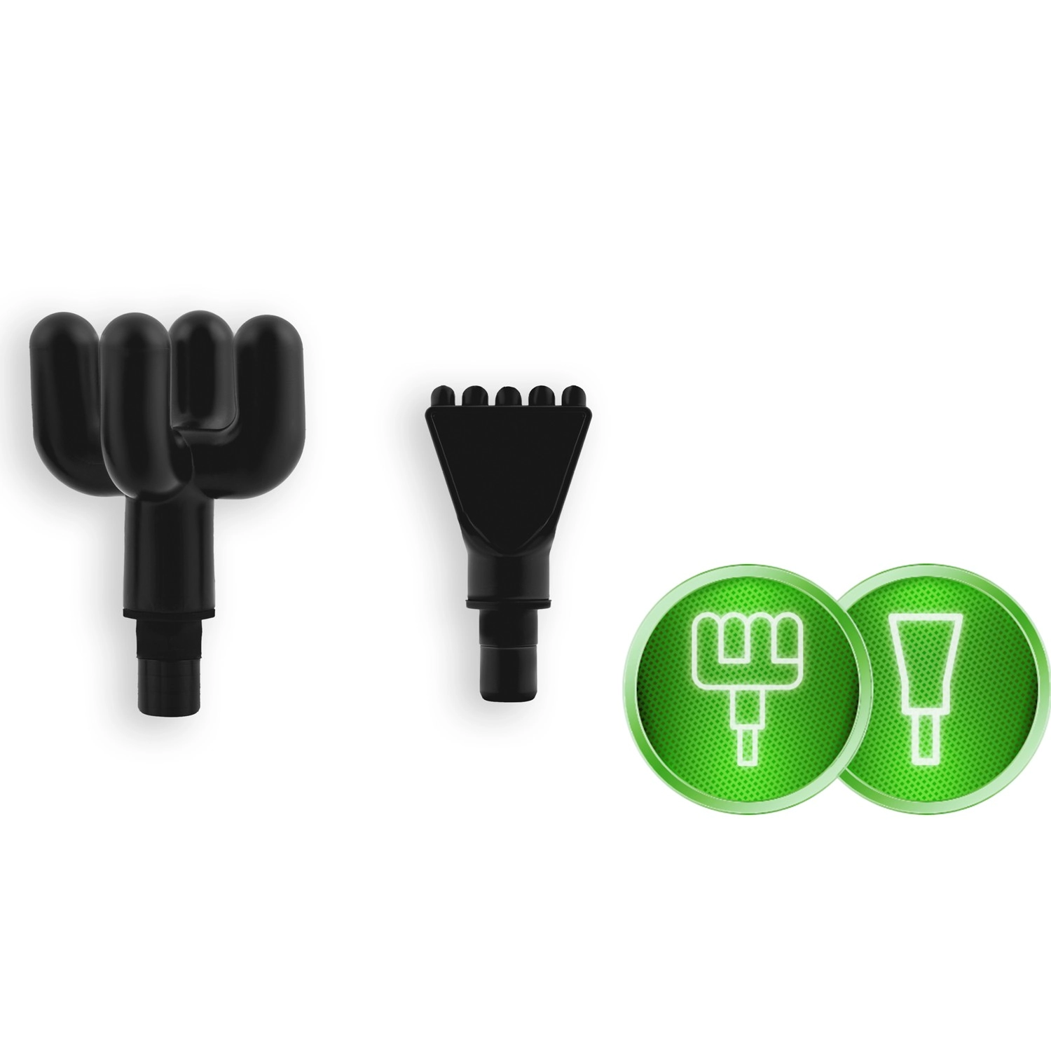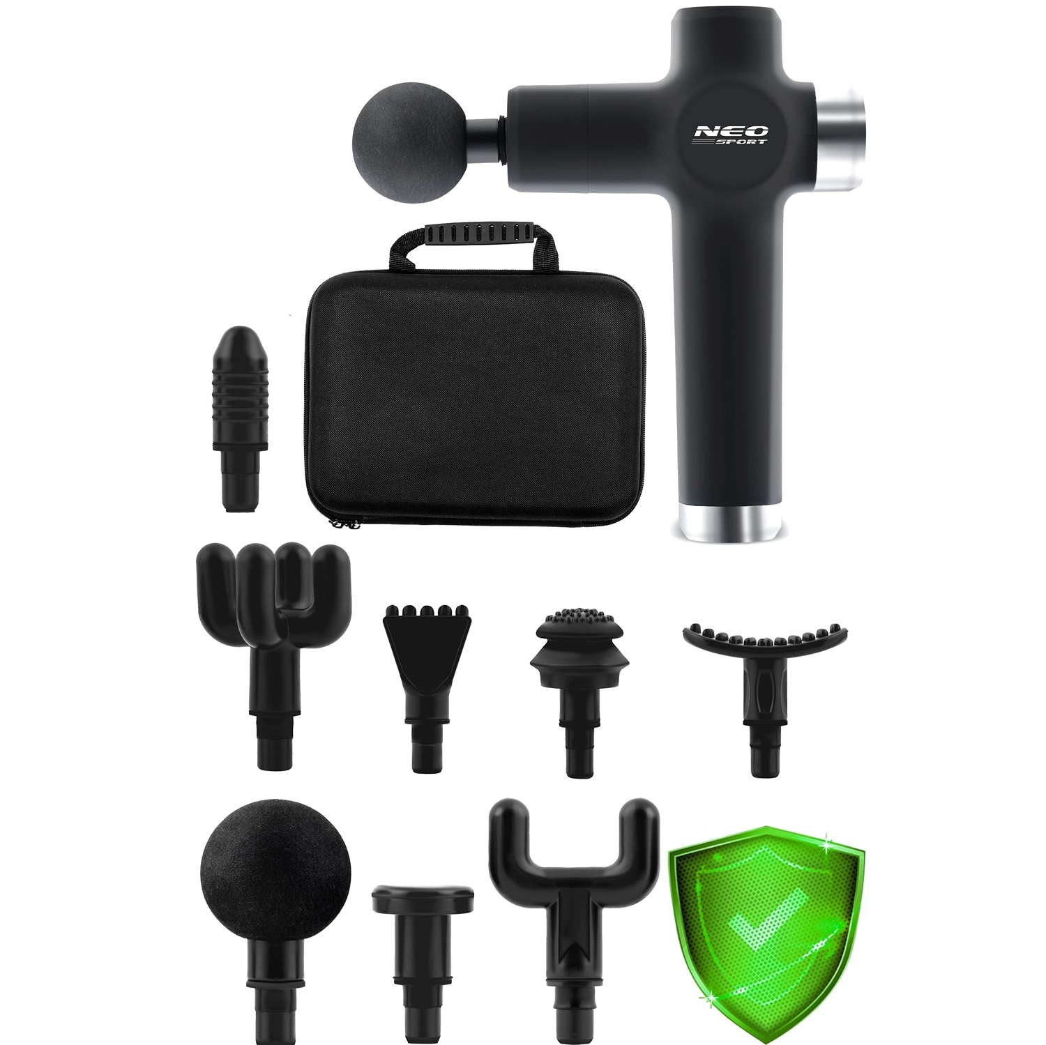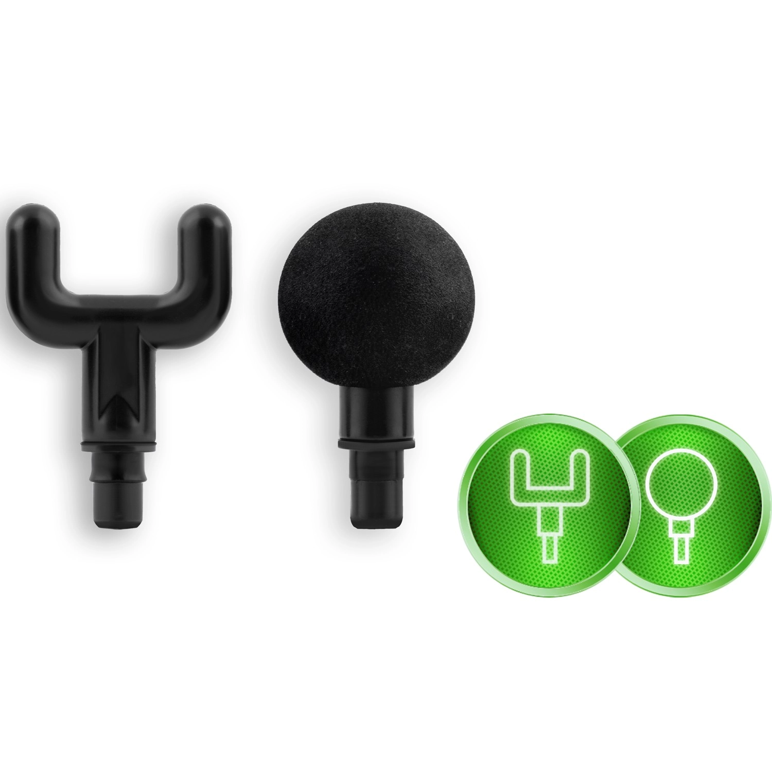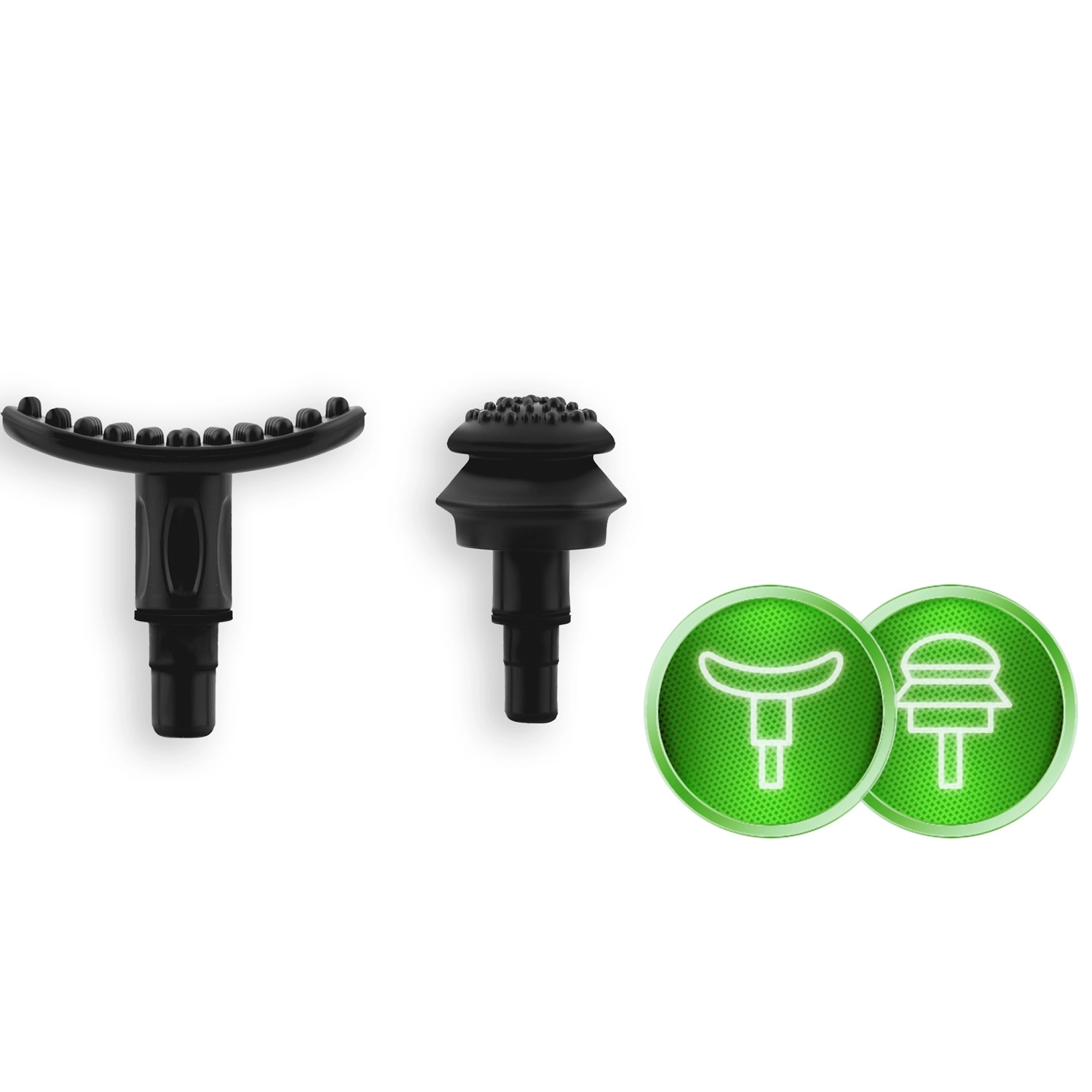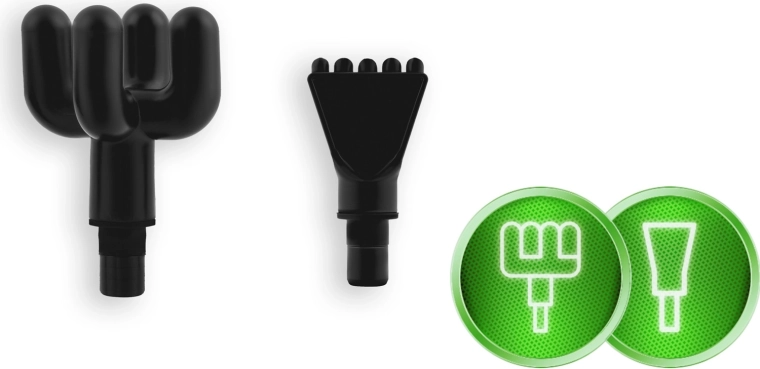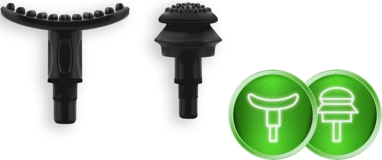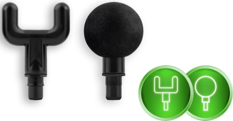Set complet de capete pentru diferite zone: bilă pentru mușchi mari, furcă pentru zona din jurul coloanei și tendoanelor, cap plat pentru țesuturi dense, „proiectil” pentru puncte trigger, cap cu patru brațe și U dublu, spatulă pentru ceafă și umeri, „banană” și „ciupercuță” moale pentru zonele foarte sensibile.