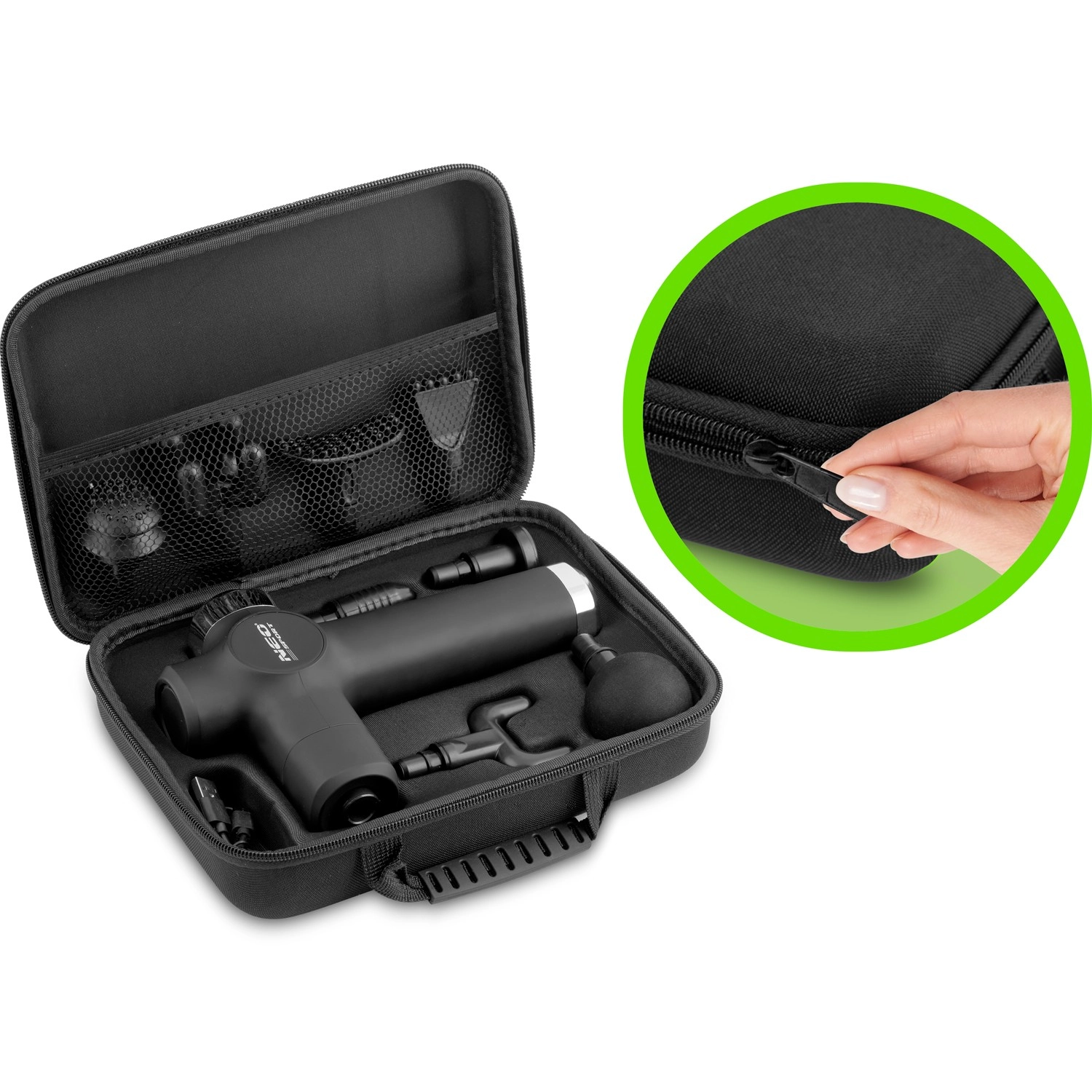 Datorită celor 8 capete, vizați cu ușurință atât grupele musculare mari, cât și punctele trigger profunde. Alegeți dintre 7 nivele de intensitate de până la aprox. 3200 rpm și adaptați masajul pentru încălzire, regenerare sau relaxare după muncă. Majoritatea capetelor (cu excepția bilei) pot fi folosite cu ulei de masaj – aveți grijă ca uleiul să nu ajungă în interiorul aparatului.