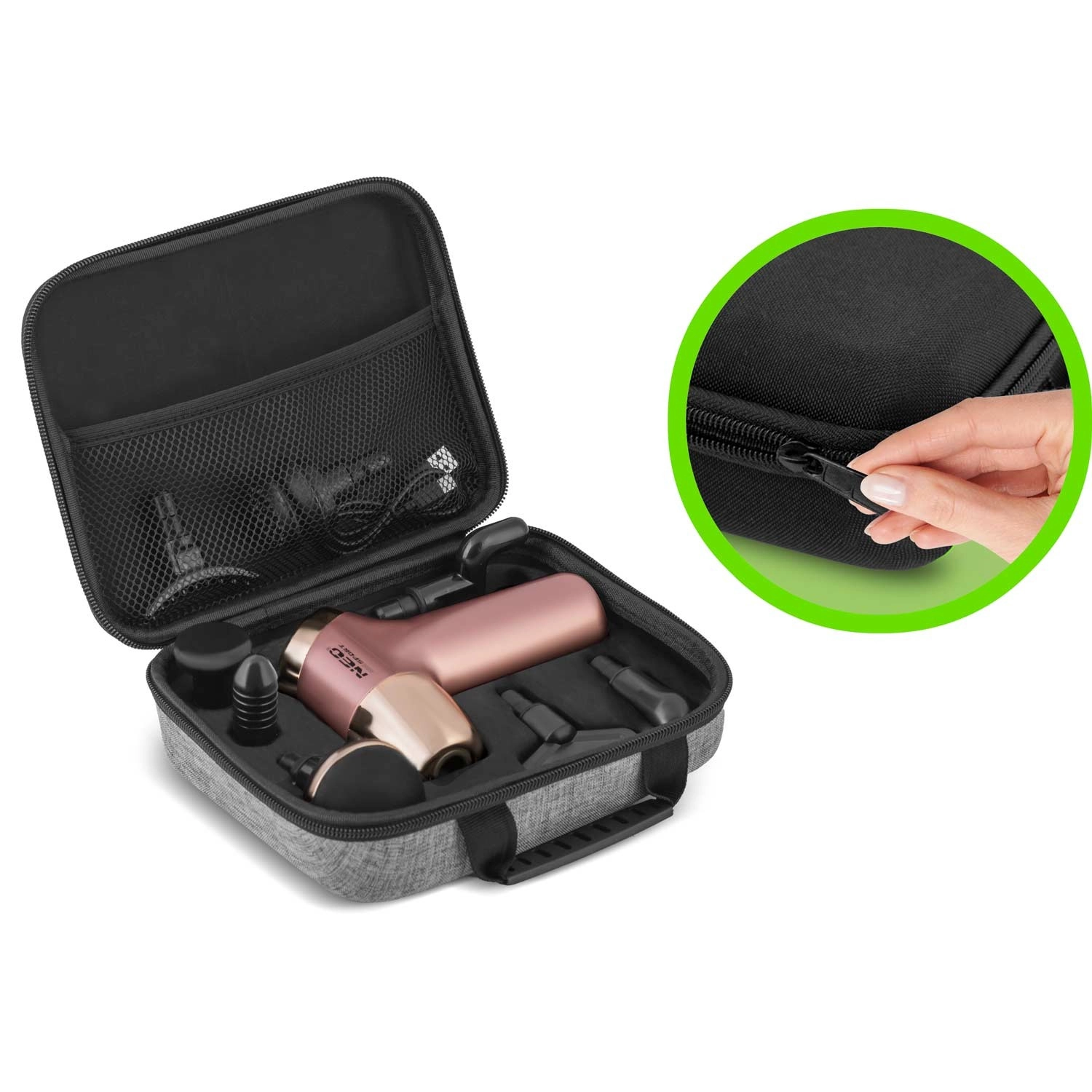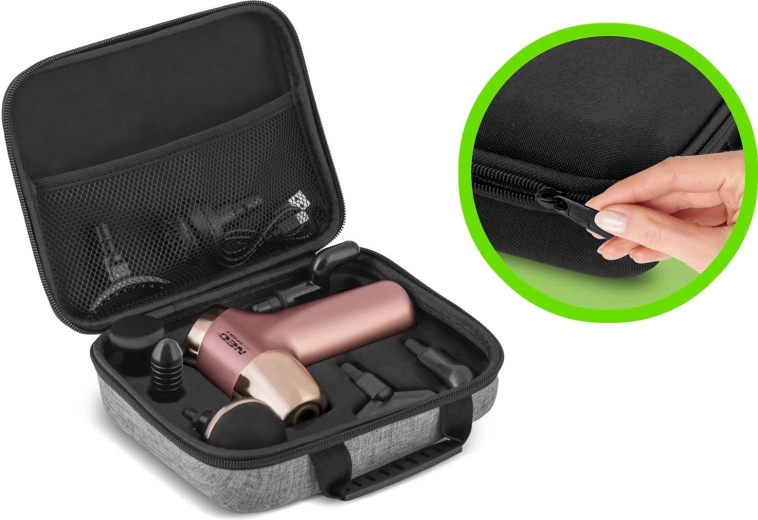 Pachetul include 8 capete specializate pentru diferite grupe musculare, o husă textilă elegantă pentru călătorie și cablu de încărcare USB‑C. Ecranul LCD permite urmărirea facilă a vitezei și a nivelului bateriei. Sistemul de siguranță protejează motorul împotriva suprasarcinii și oprește automat dispozitivul la presiune prea mare.