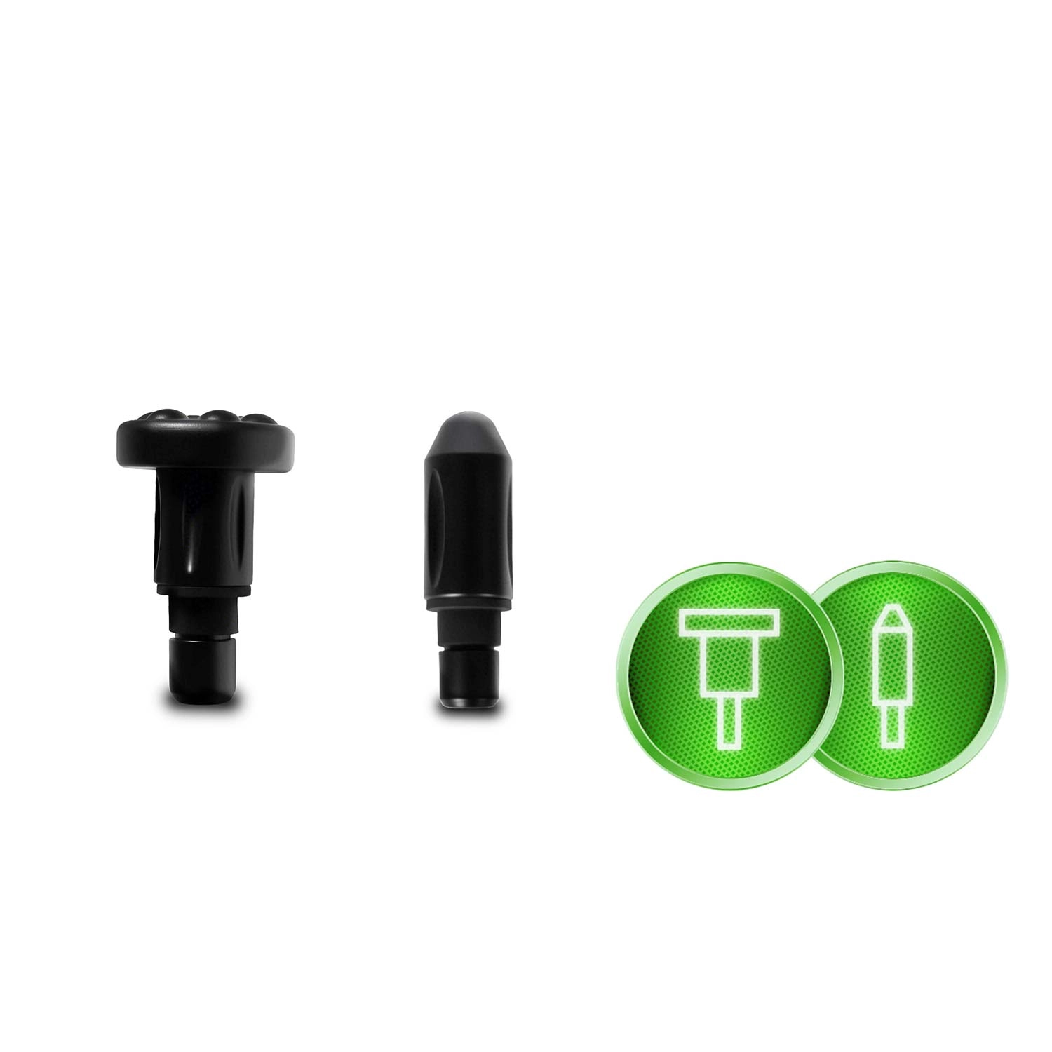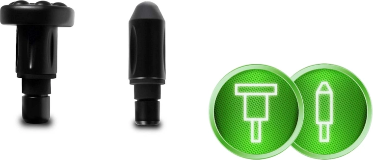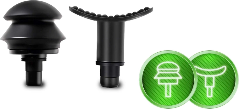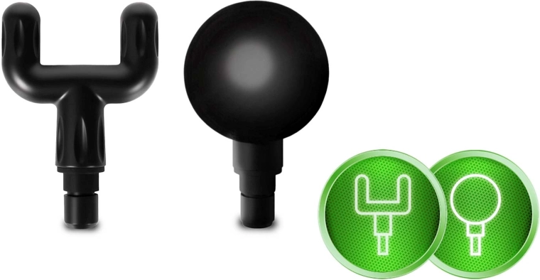 În pachet găsești 6 capete interschimbabile: sferic pentru grupuri musculare mari, furcă în U pentru zona coloanei și tendoane, cap plat cu proeminențe pentru stimulare mai amplă, „proiectil” pentru presiune profundă precisă, „burete” moale pentru zone sensibile și cap curbat cu proeminențe ideal pentru tălpi și gambe. Toate capetele, în afară de cel sferic, pot fi folosite cu ulei de masaj (aveți grijă ca uleiul să nu pătrundă în interiorul dispozitivului și nici pe zona de fixare).