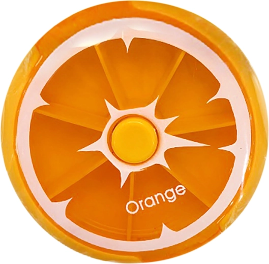 Fără pastile uitate. Acest dozator rotund pentru medicamente, cu atractivul motiv de portocală, oferă o organizare simplă și rapidă a medicației. Este ideal pentru utilizarea zilnică, călătorii și la birou.