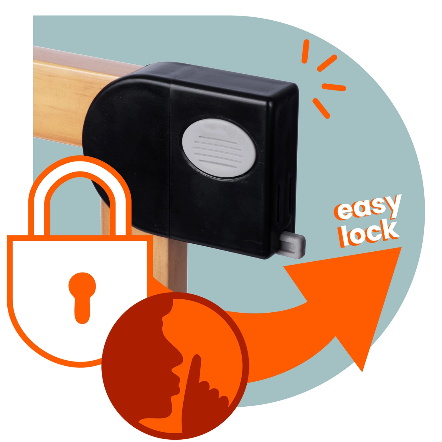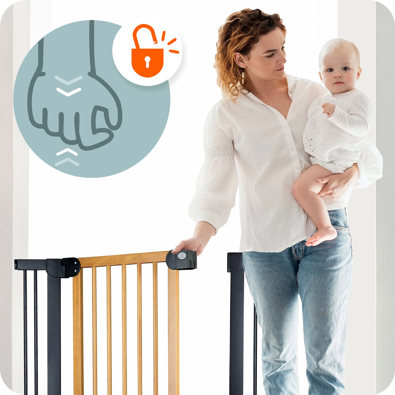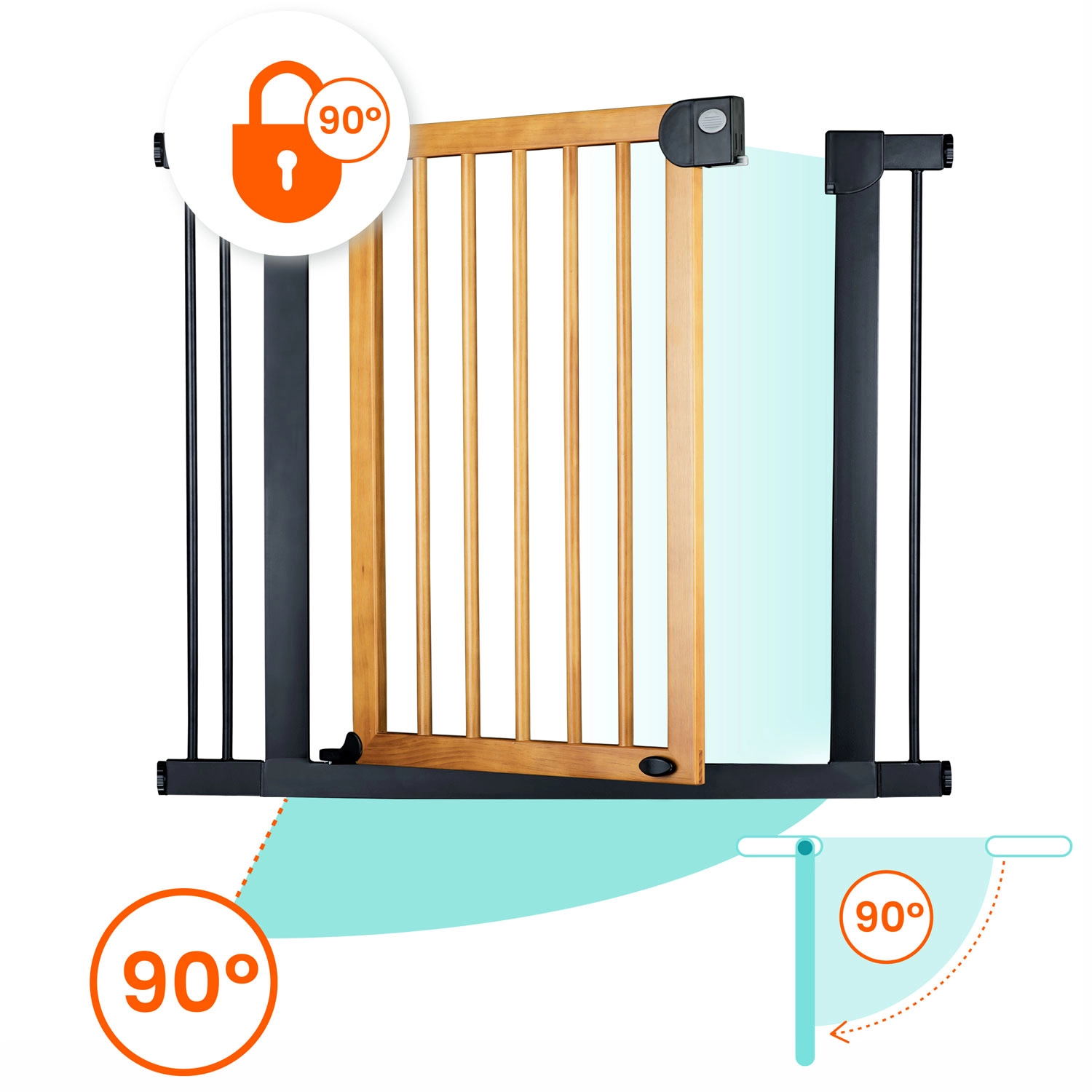 Mecanismul bine gândit cu dublă siguranță nu poate fi deschis de către copil, însă un adult îl poate acționa confortabil cu o singură mână. Bariera se deschide în ambele direcții și poate fi blocată la un unghi de 90° pentru trecere fără obstacole. Închiderea silențioasă și ușoară sporește confortul utilizării zilnice.