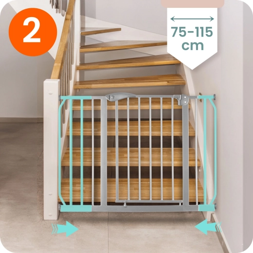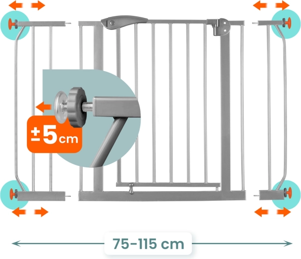 Bariera de siguranță NUKIDO, în nuanță gri neutră, se potrivește perfect interioarelor moderne datorită construcției metalice. Montajul se realizează prin presiune – fără găurire, astfel încât nu deteriorează pereții sau tocurile. Pachetul conține două extensii (10 cm și 20 cm) și 4 regulatoare de lățime, datorită cărora bariera se adaptează cu ușurință trecerilor între 75 și 115 cm.