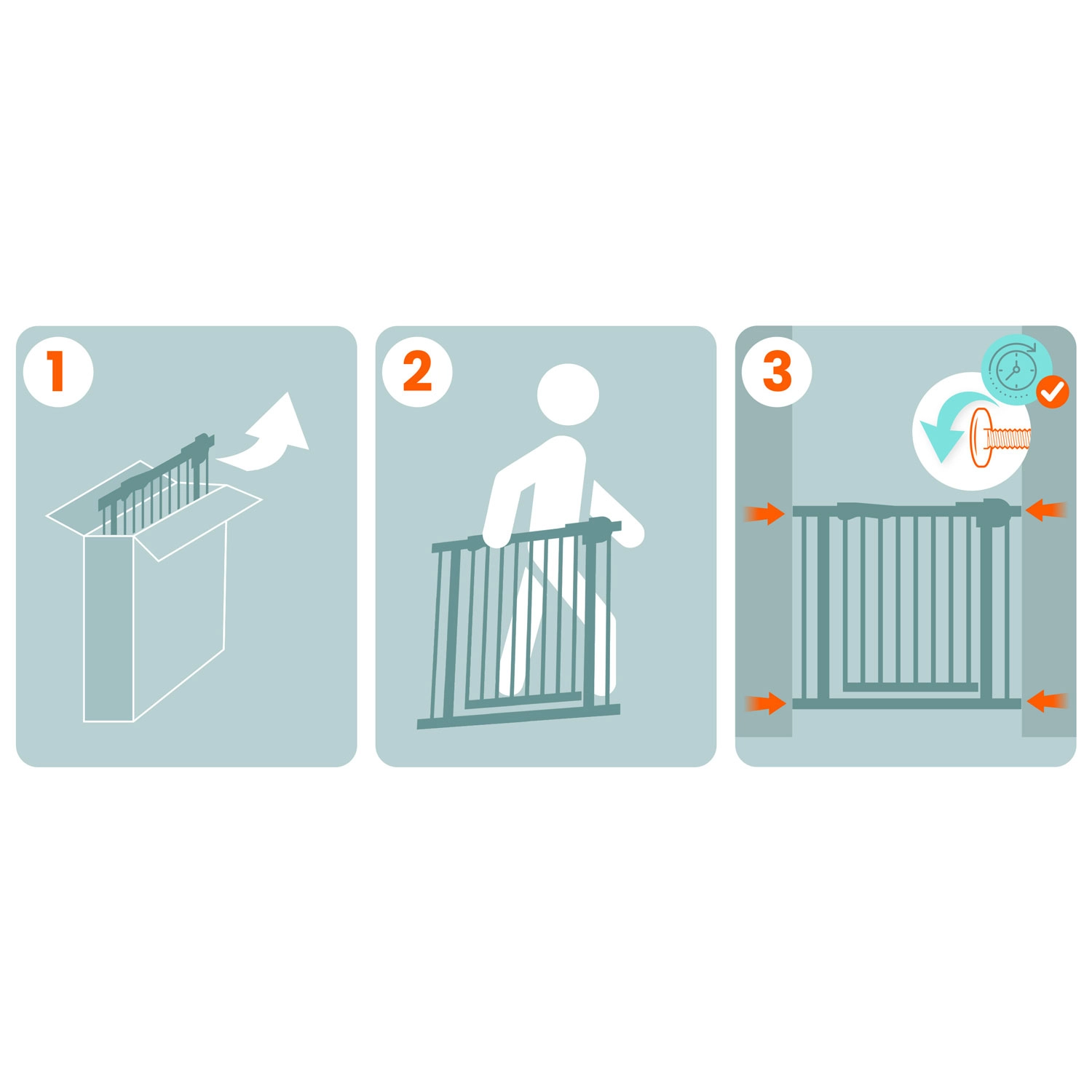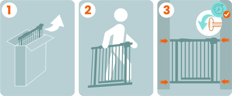 Fixarea prin presiune în patru puncte asigură o prindere fermă în tocuri sau pasaje. Bariera se instalează și se demontează ușor, fără unelte.