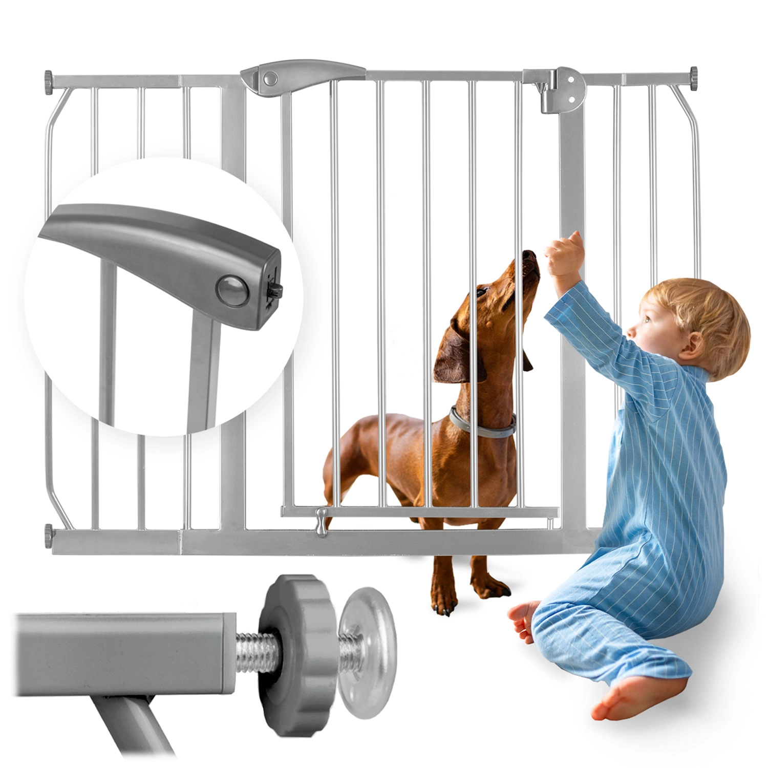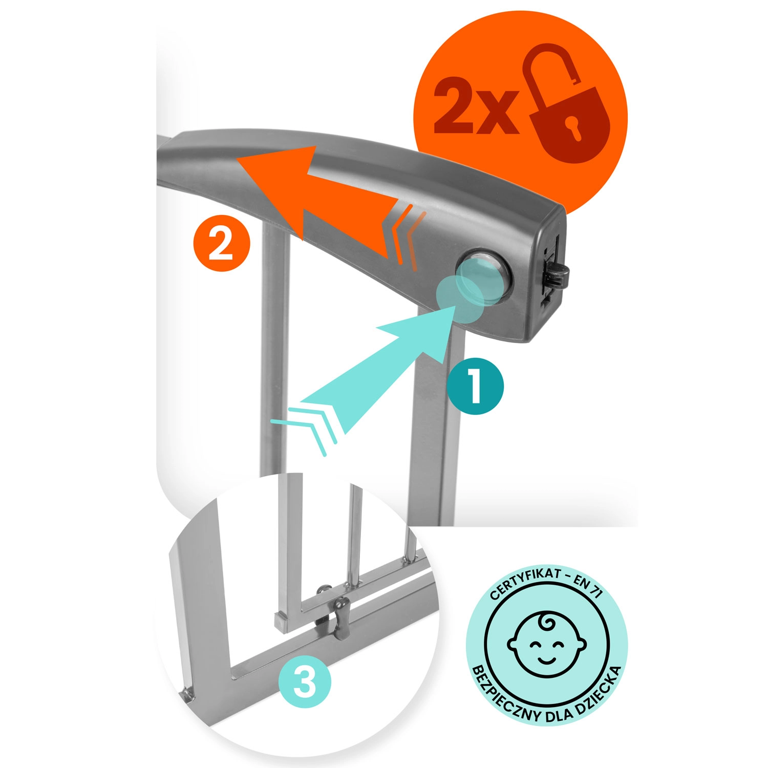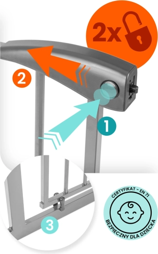 Mecanismul inteligent cu siguranță în două trepte este dificil de deschis pentru copii, însă adulții îl pot manevra cu o singură mână. Ușița se deschide în ambele direcții, poate fi blocatǎ la un unghi de 90° și dispune de închidere silențioasă cu zăvor automat. Cele patru puncte de prindere și metalul robust asigură stabilitate și durabilitate.