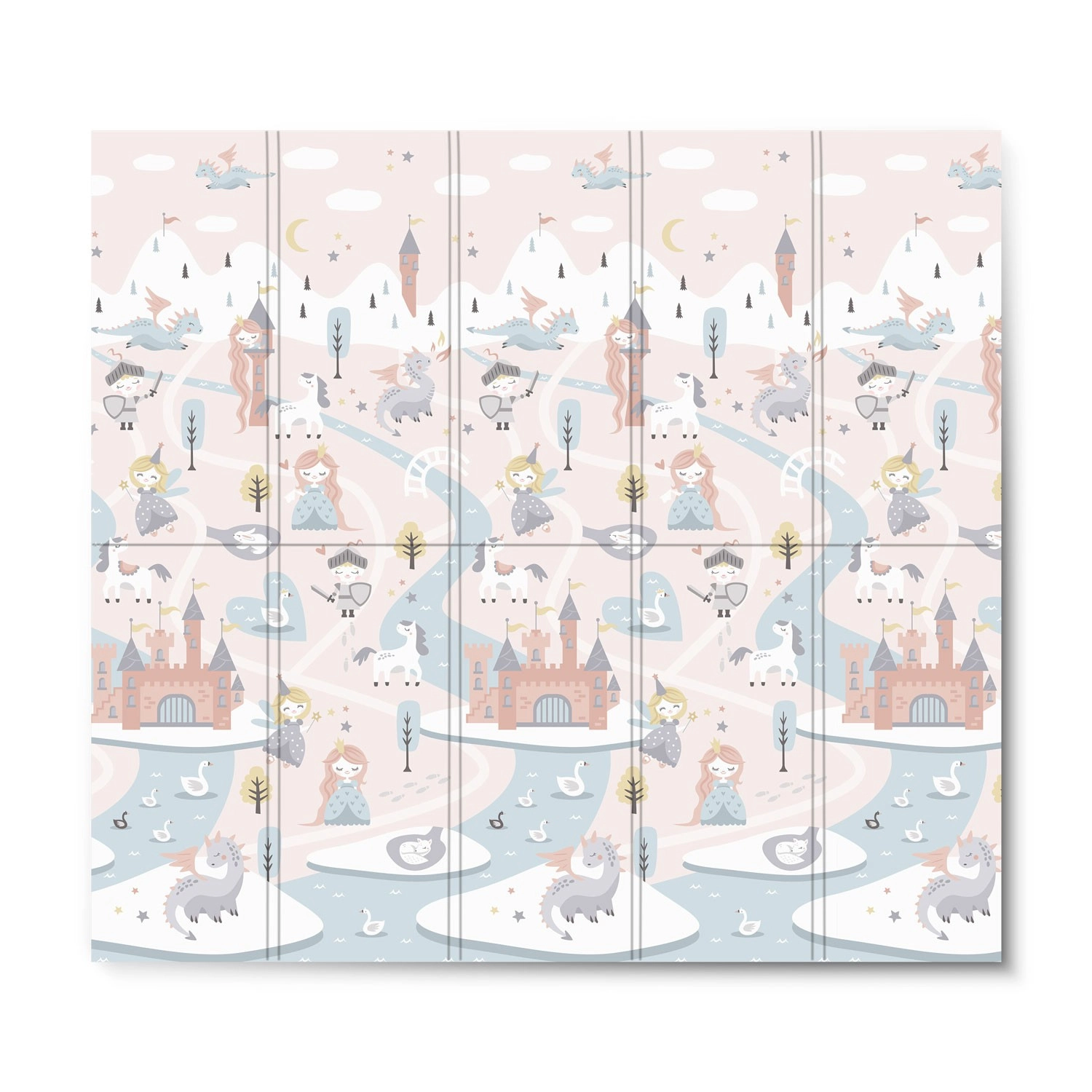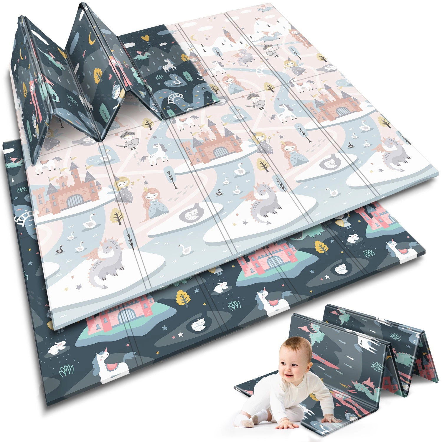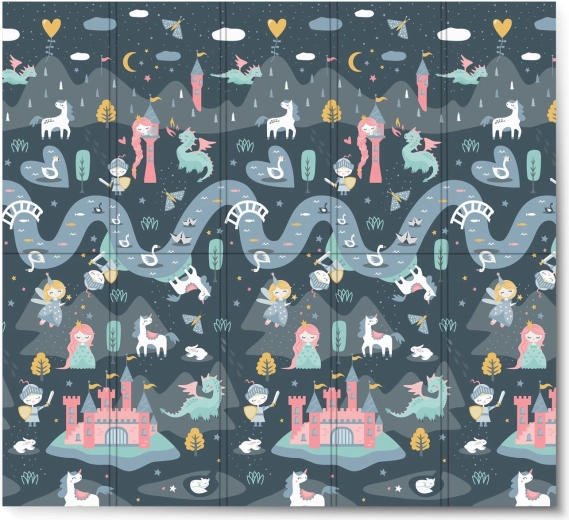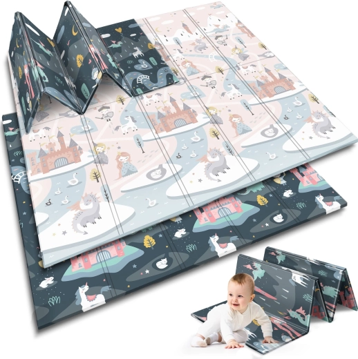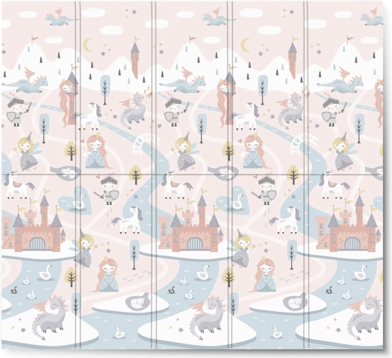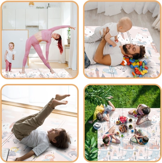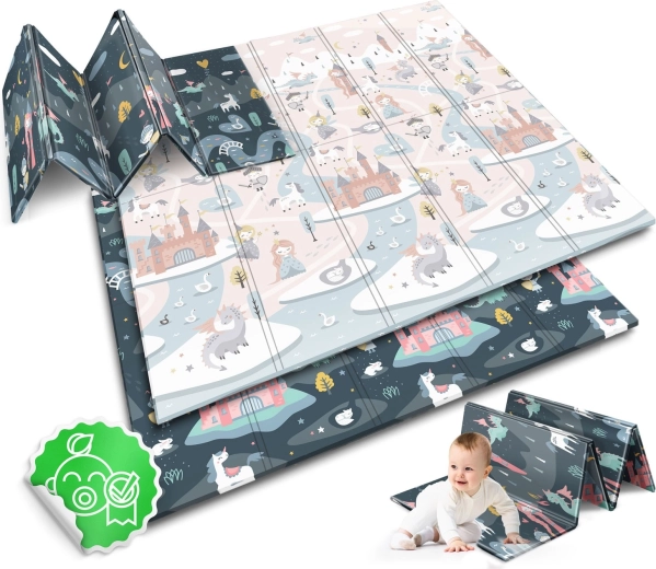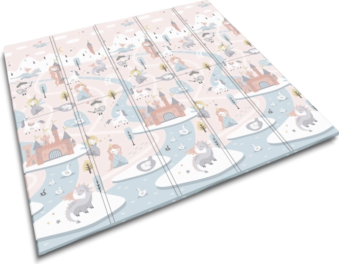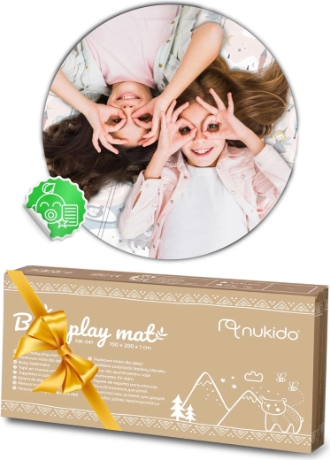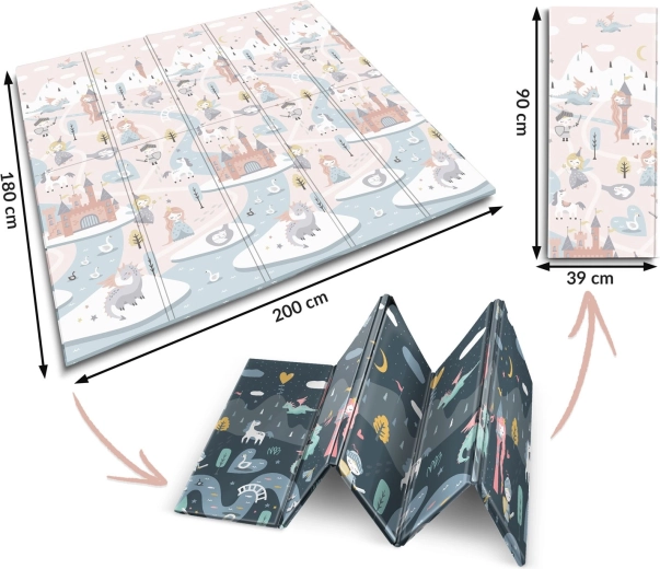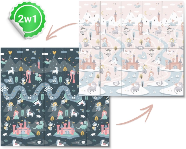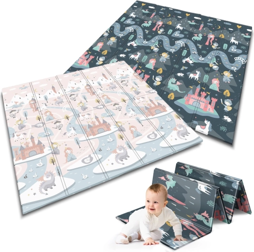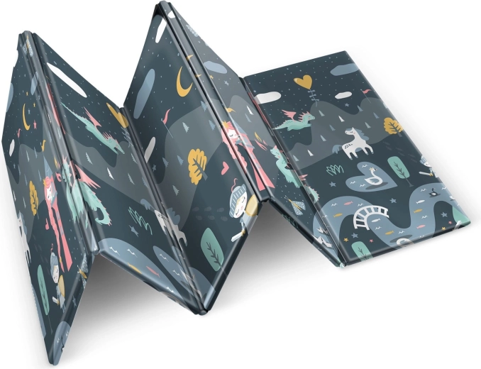 Salteaua de joacă pliabilă NUKIDO, din spumă XPE premium fără miros, creează o suprafață moale, antiderapantă și igienică pentru bebeluși și preșcolari. Datorită grosimii de 1 cm, absoarbe eficient șocurile, protejează de pardoseala dură și oferă izolație termică. Imprimeul dublu față propune două variante stilate – motive pastelate delicate și un design de basm mai închis – pentru a se integra în interior și a-i încânta pe cei mici mai mult timp.