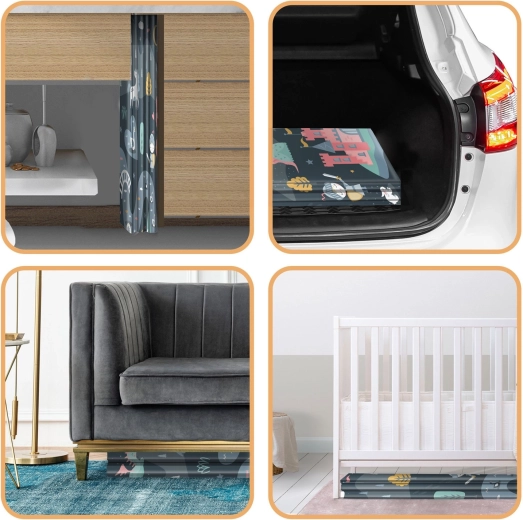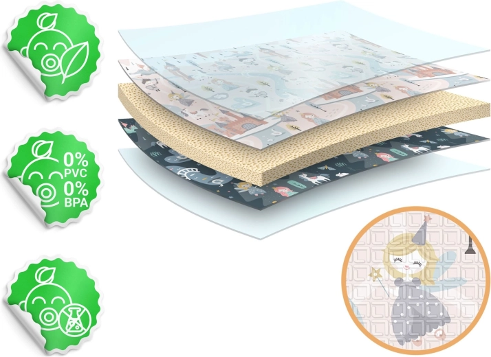 Salteaua se pliază rapid tip acordeon, se transportă ușor și se depozitează sub pat sau în mașină. Suprafața impermeabilă se șterge cu o lavetă umedă, lucru util acasă, în vizită sau afară la picnic. Materialul este fără BPA/PVC/ftalați/formamidă, respectă CE și testele EN71-1/2/3, astfel că vă puteți baza pe calitate și siguranță verificate.