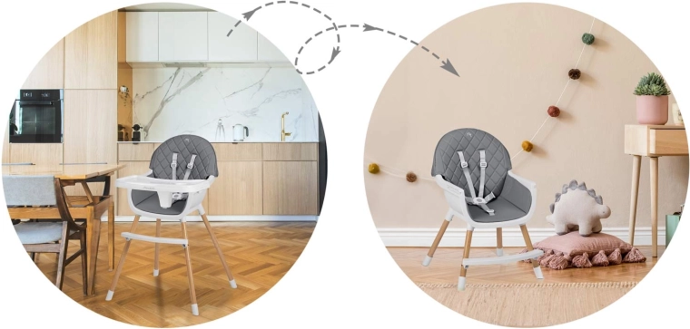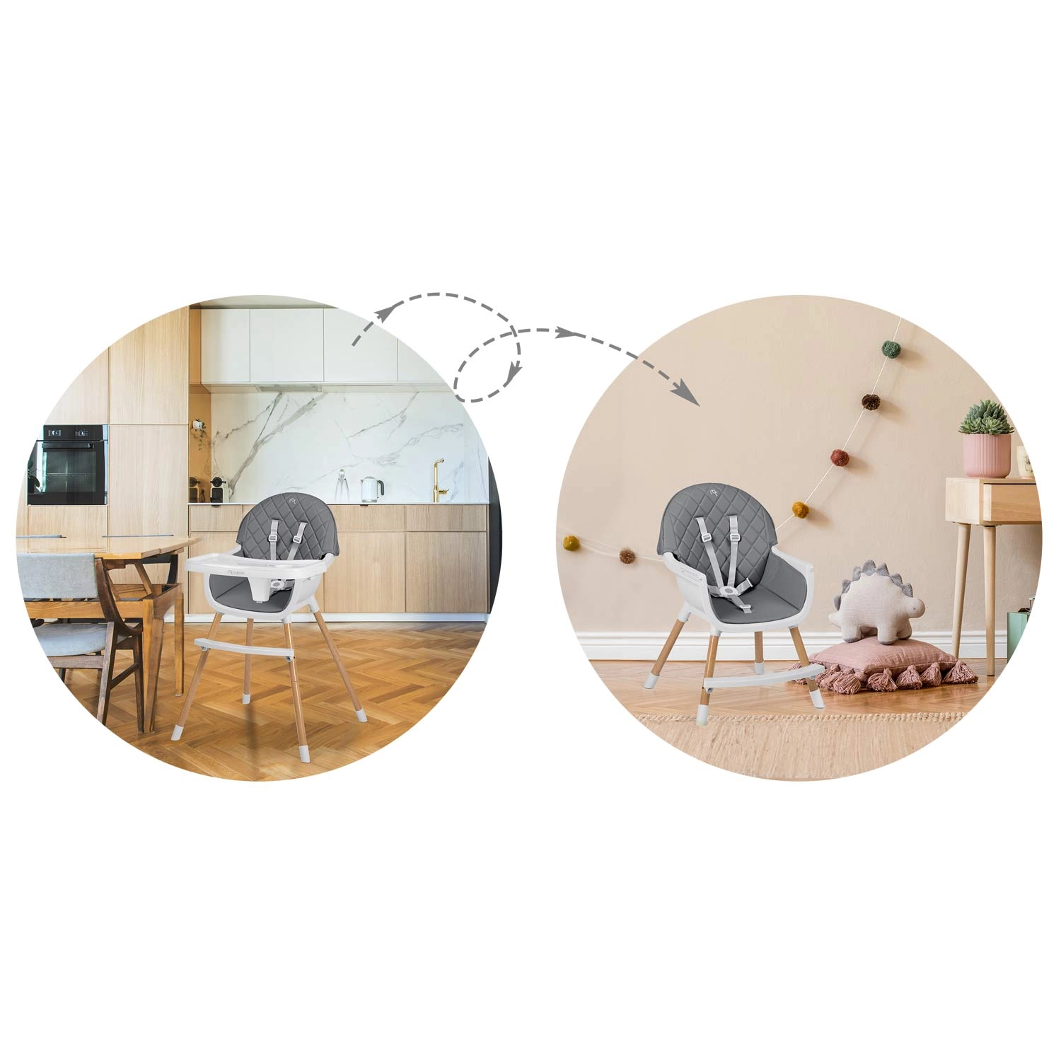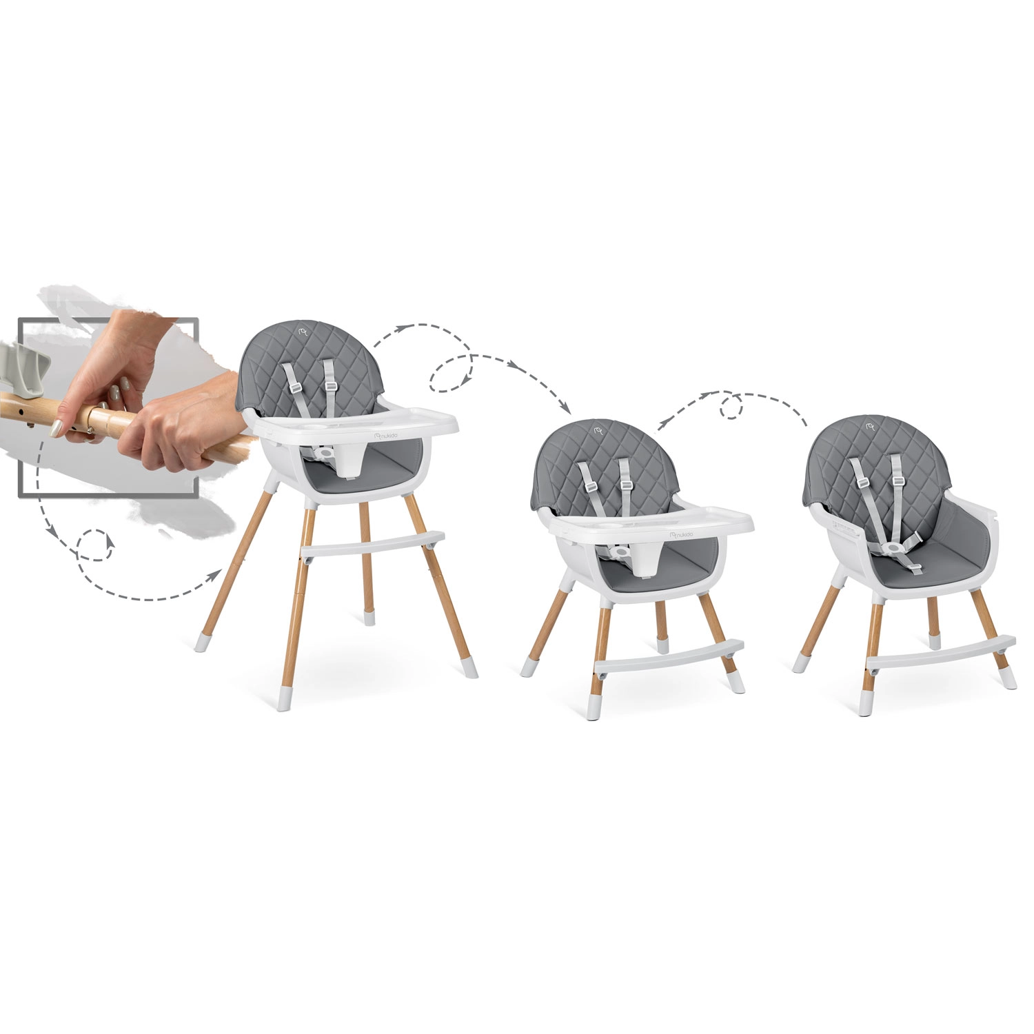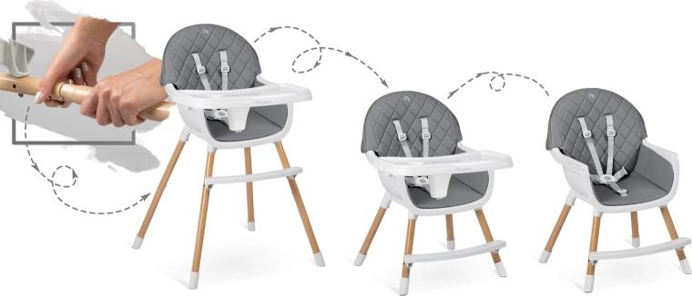 - funcție 3‑în‑1 (scaun înalt / scăunel jos / șezut independent)